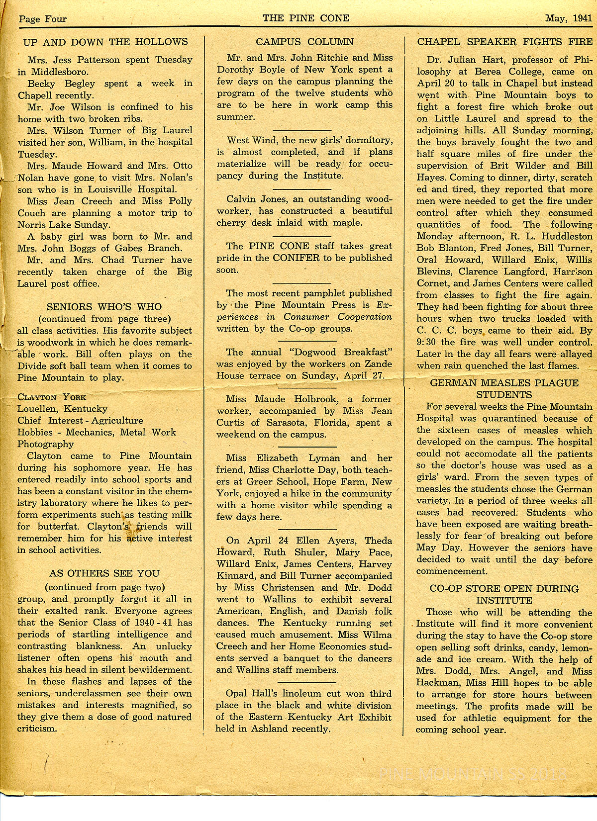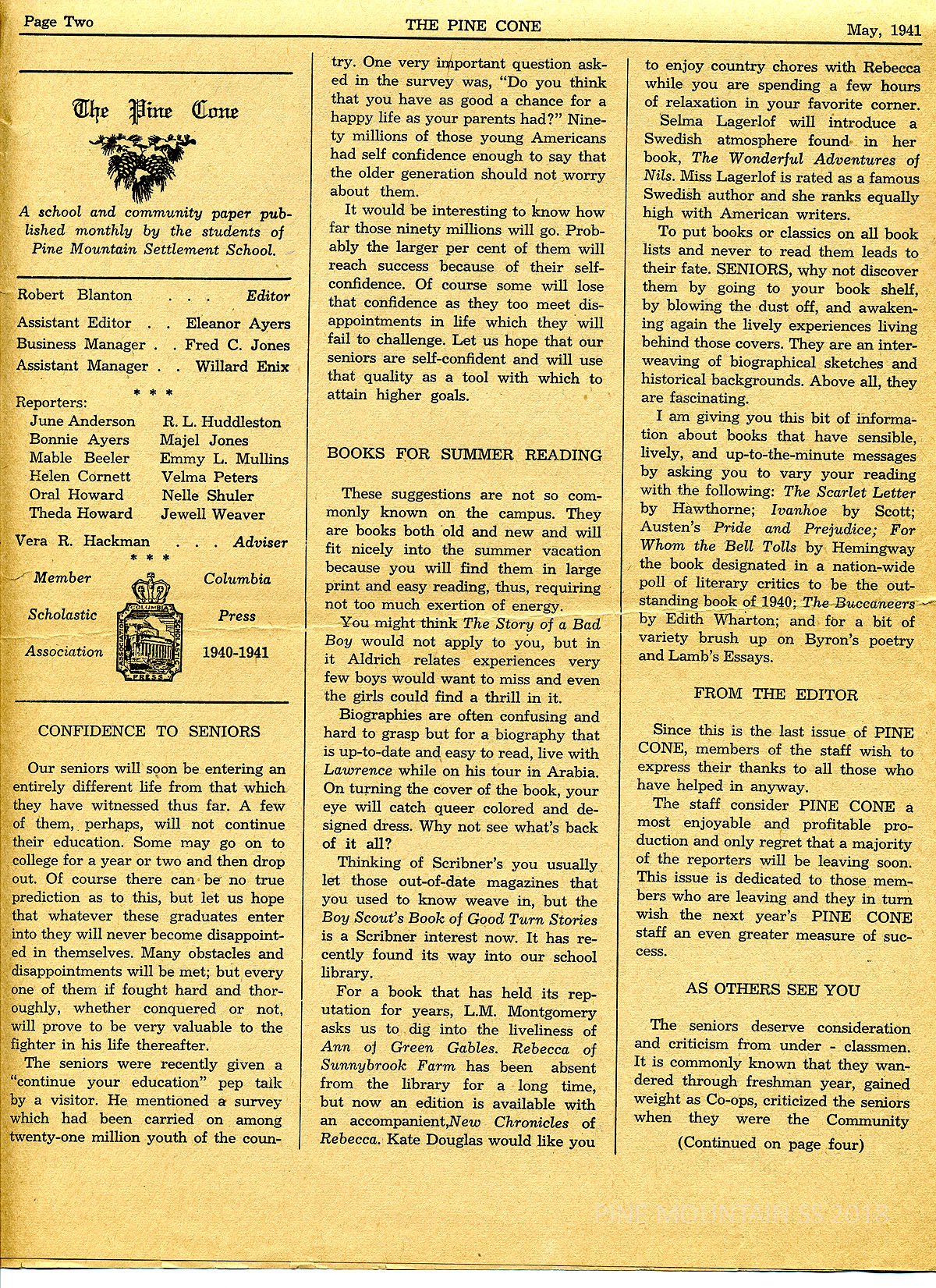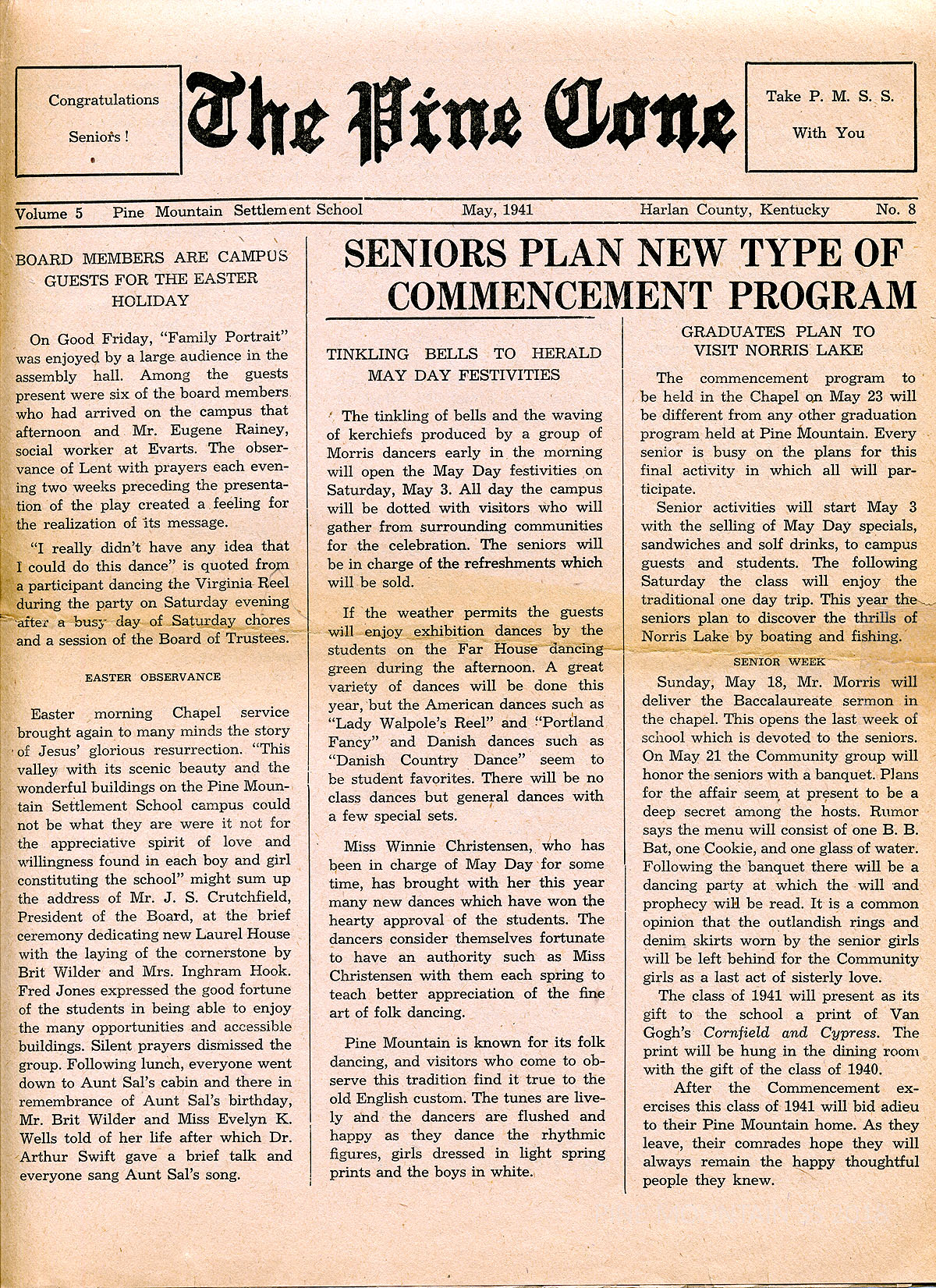 THE PINE CONE – “A school and community paper published monthly by the students of Pine Mountain Settlement School.”