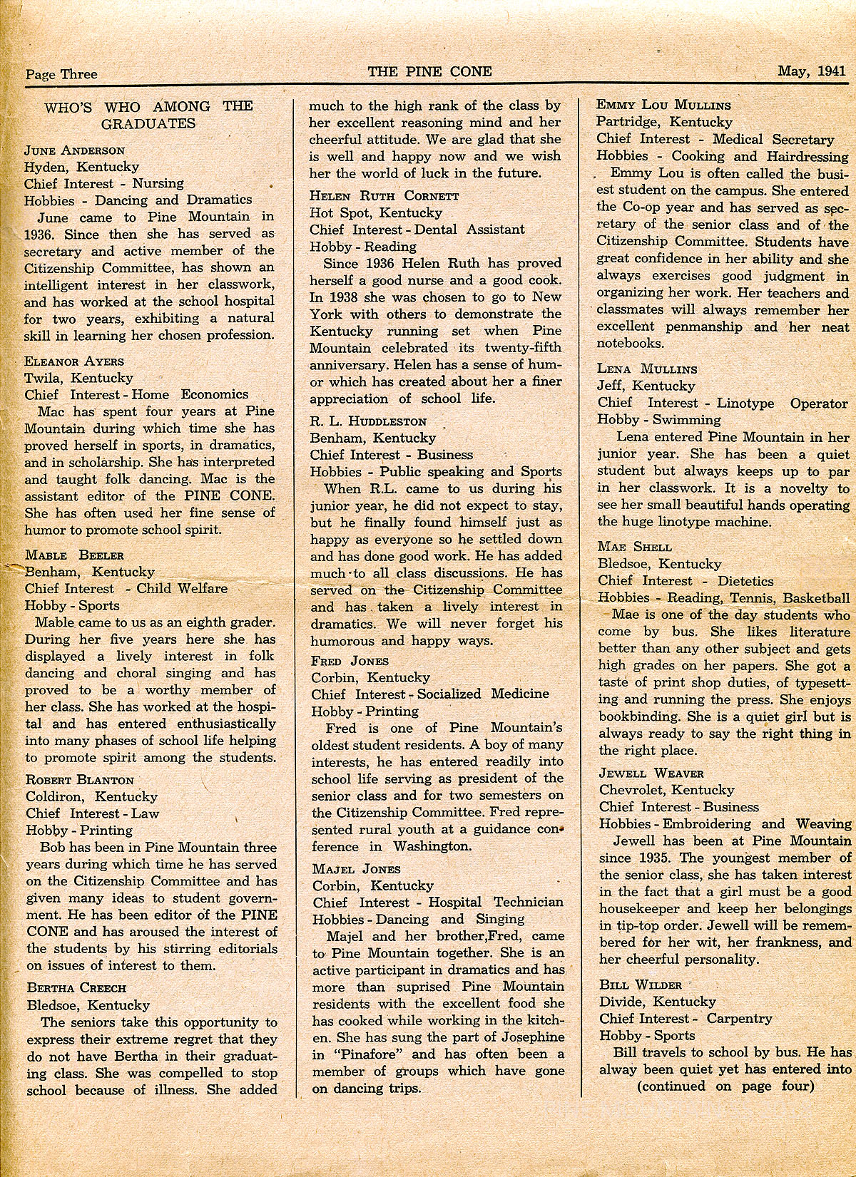 “WHO’S WHO AMONG THE GRADUATES” – June Anderson, Eleanor Ayers, Mable Beeler, Robert Blanton, Bertha Creech, Helen Ruth Cornett, R. L. Huddleston, Fred Jones, Majel Jones, Emmy Lou Mullins, Lena Mullins, Mae Shell, Jewell Weaver, Bill Wilder.