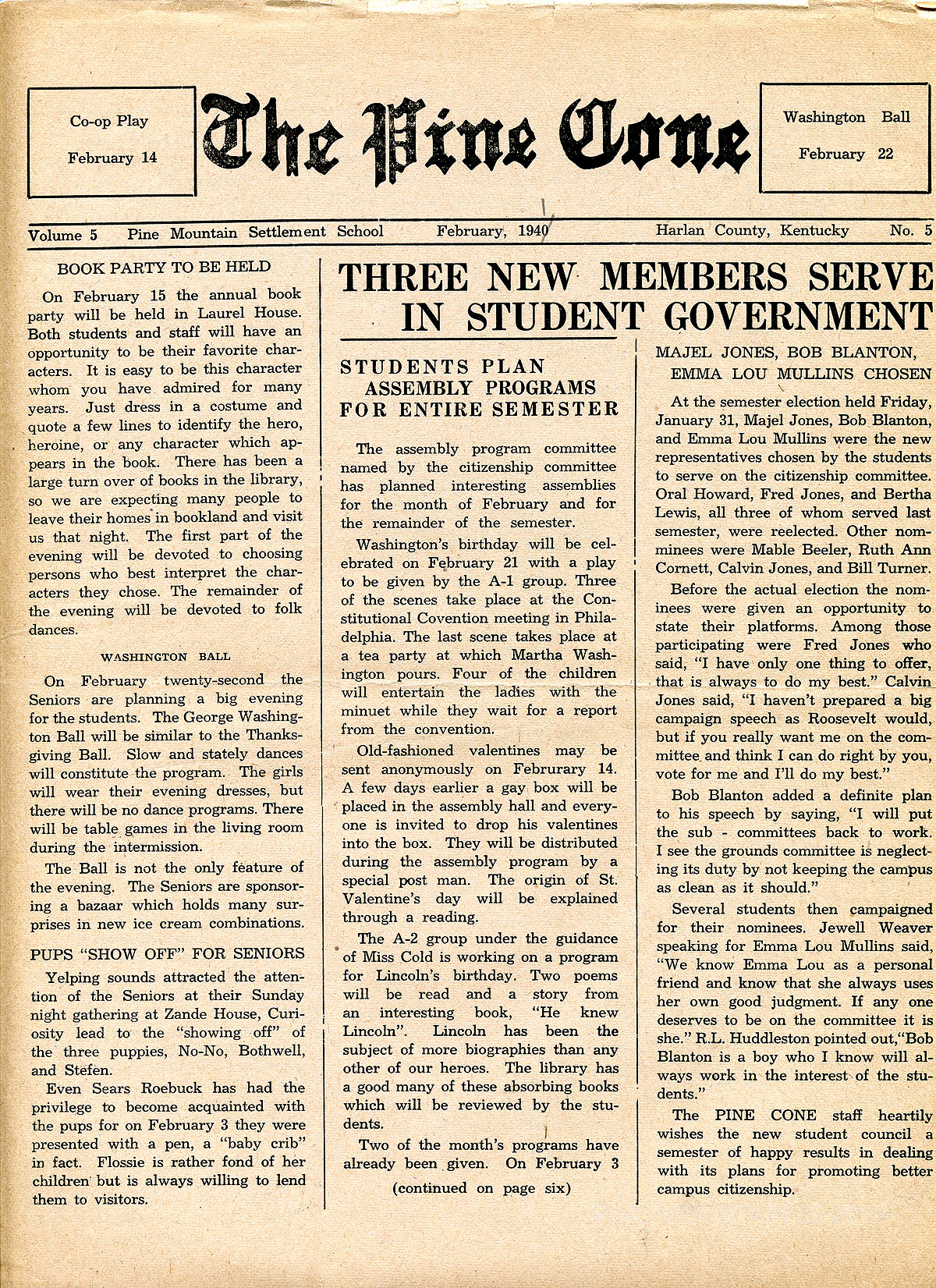 “STUDENTS PLAN ASSEMBLY PROGRAMS FOR ENTIRE SEMESTER” – a play on Washington’s Birthday; exchange of anonymous valentines on Valentine’s Day; Lincoln’s Birthday program arranged by Miss Cold.