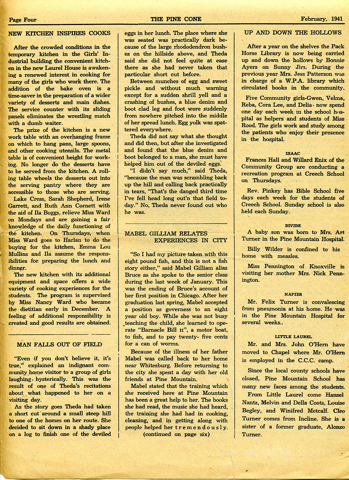 “MASONS CROSS MOUNTAIN FOUR TIMES DAILY” – “Arnie Franklin, Frank Cornett, Woodard Cornett and Charlie Ingram, stonemasons working on the new girls’ dormitory and living on Linefork, cross Pine Mountain four times daily coming and going via Cumberland and Laden to reach their work.”