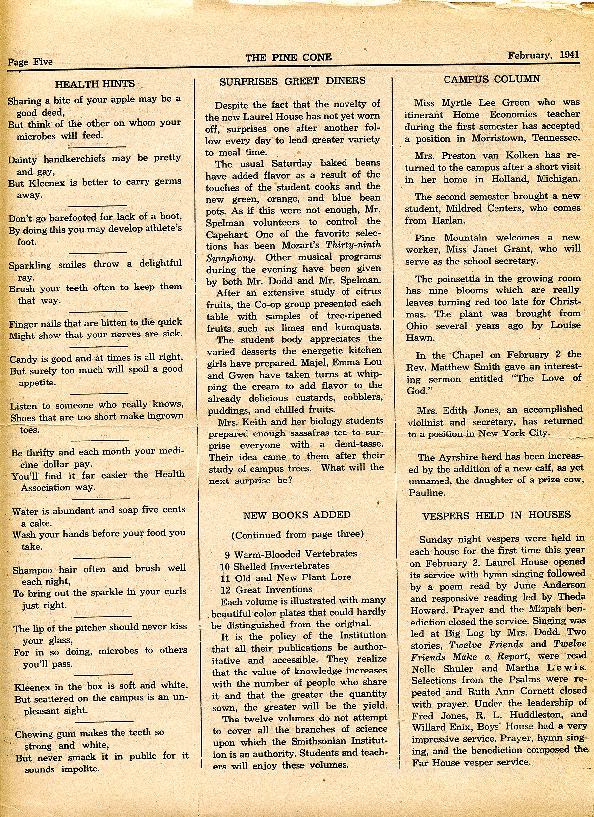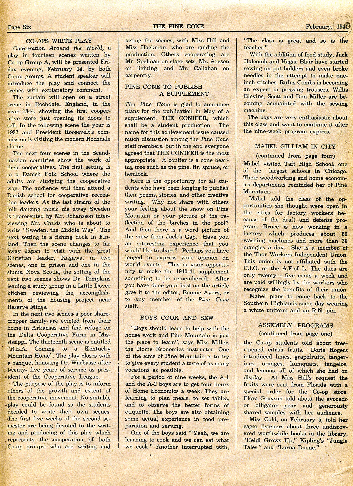 TAGS: Pine Cone 1941 February, student writings, student government, essays, poems, stonemasons, alumni news, new Laurel House, Pack Horse Library, student activities, community news