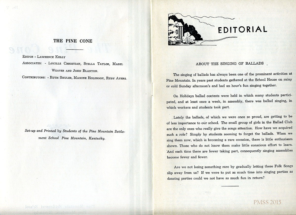 Front Cover: “Vol. V, No. V. The Pine Cone, Pine Mountain Settlement School, Pine Mountain, Kentucky”