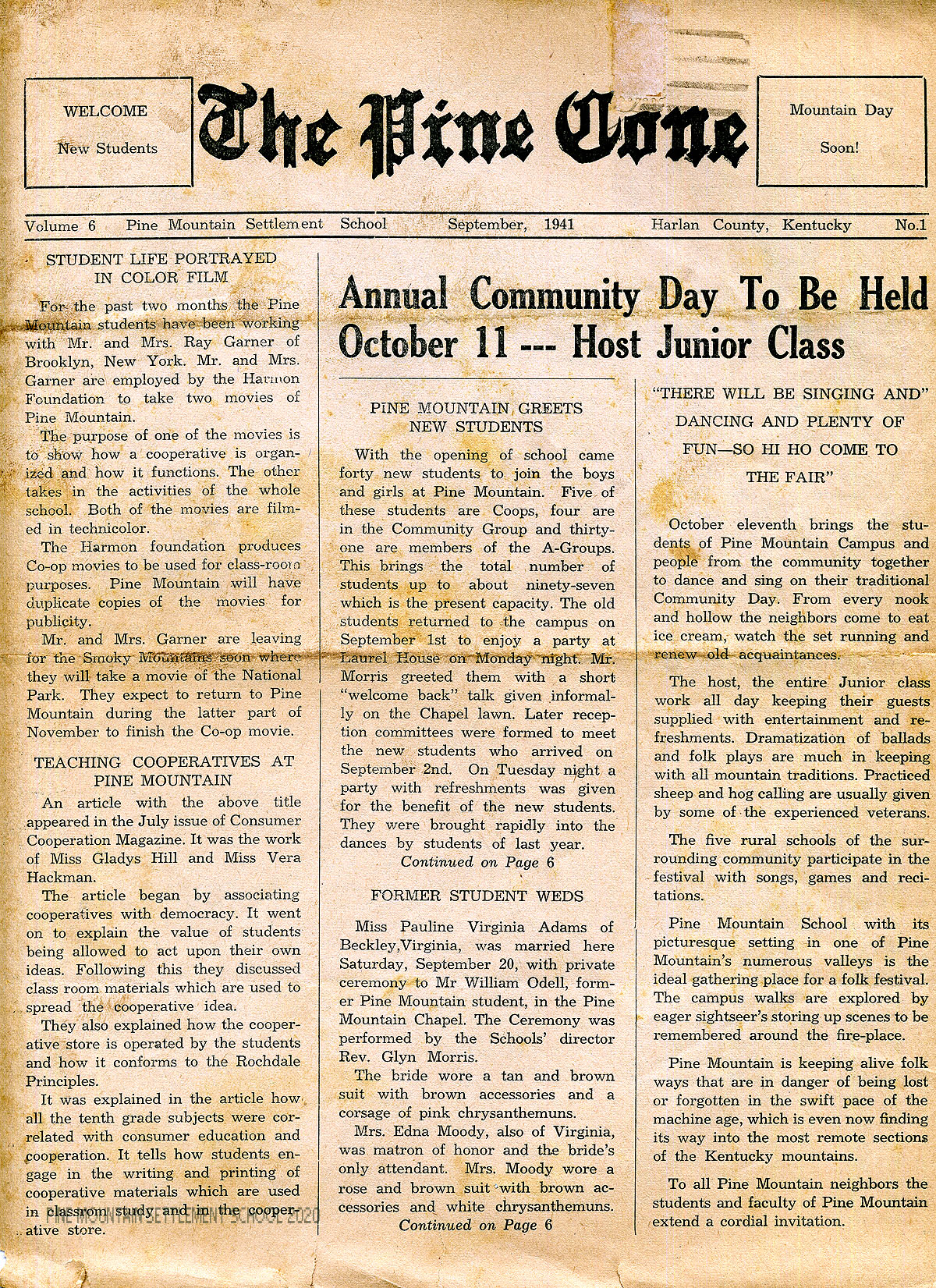 TAGS: The Pine Cone 1941 September, new students, new workers, Community Day, filming, Mr. and Mrs. Ray Garner, cooperatives, Harmon Foundation, weddings, summer camps, book donations, Infirmary, sports, teacher training films, D.A.R., Southern Mountain Workers