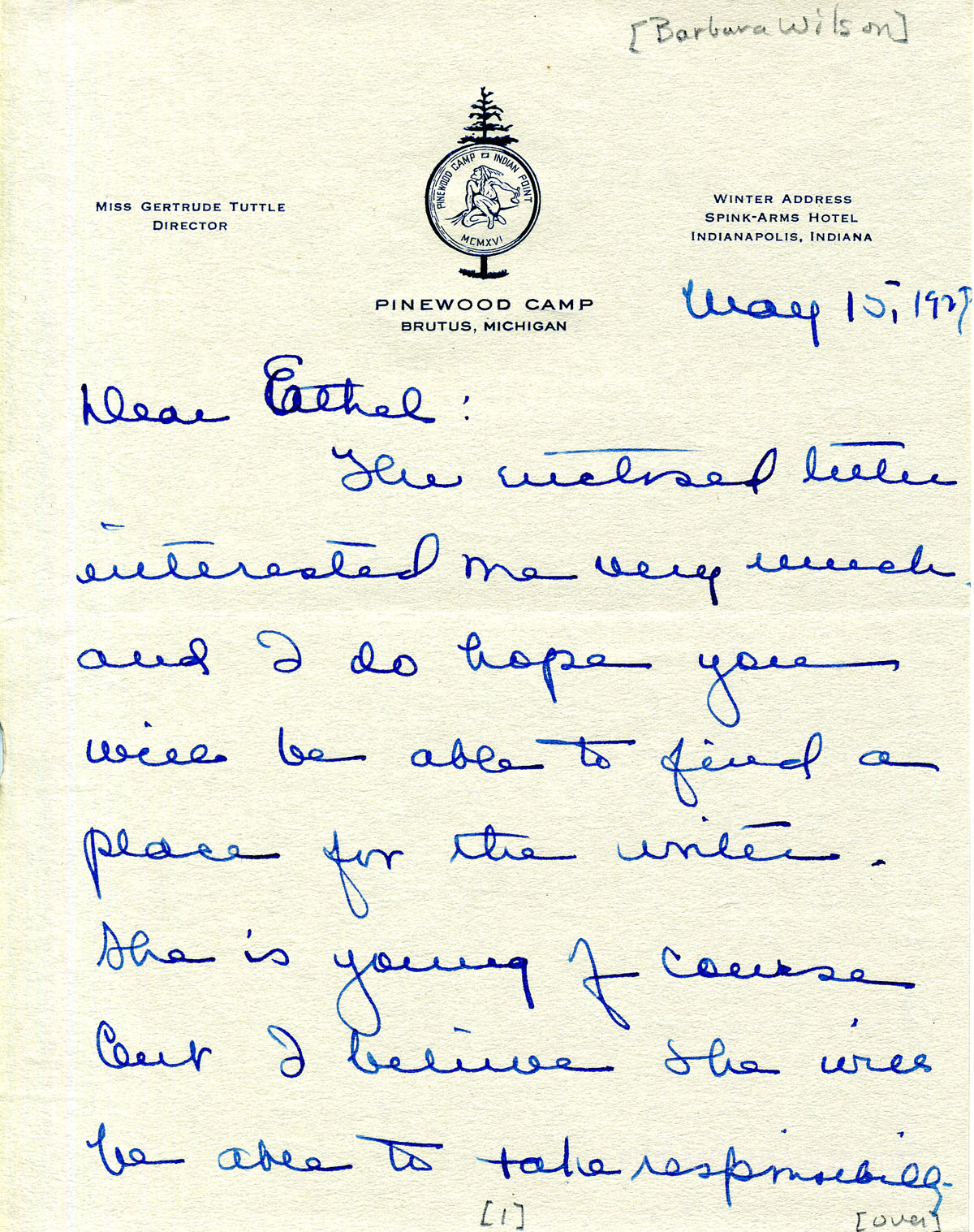 066 Wilson, Barbara [regarding] Mrs. Gertrude Tuttle, Director, Pinewood Camp, Brutus, MI, to Ethel de Long Zande. May 15. Mrs. Tuttle recommends Miss Wilson for an internship at PMSS. She describes her as a fine person and looks for ways to increase the collaboration of Pinewoods Camp and Pine Mountain.