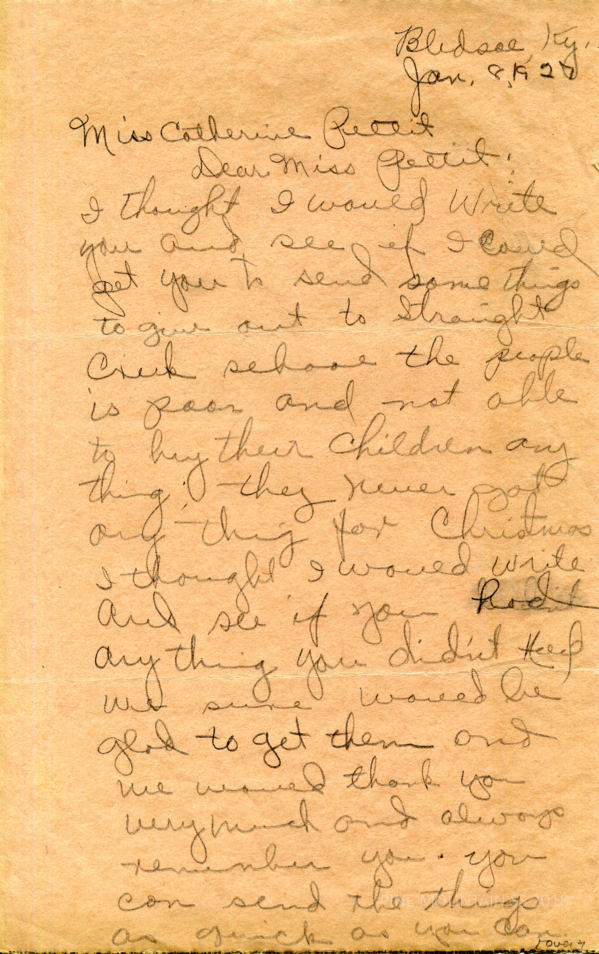 067 Wilson, Lillie Marie, Bledsoe, KY to Katherine Pettit. January 8. Asks for help from PMSS for the Straight Creek School, that is often left out of gifts coming to PMSS for children in the community. Miss Wilson hopes to hand out gifts on the last day of school.