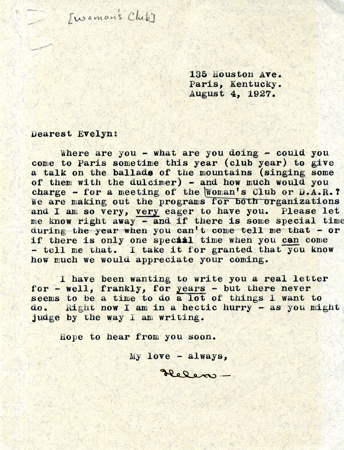 069 Woman’s Club, Paris, KY. (Helen Hutchcraft) to Evelyn K. Wells. August 4. Helen asks Miss Wells to come speak to the Club and bring her dulcimer and sing some ballads for the Women’s Club or D.A.R.. Both clubs are to meet jointly.