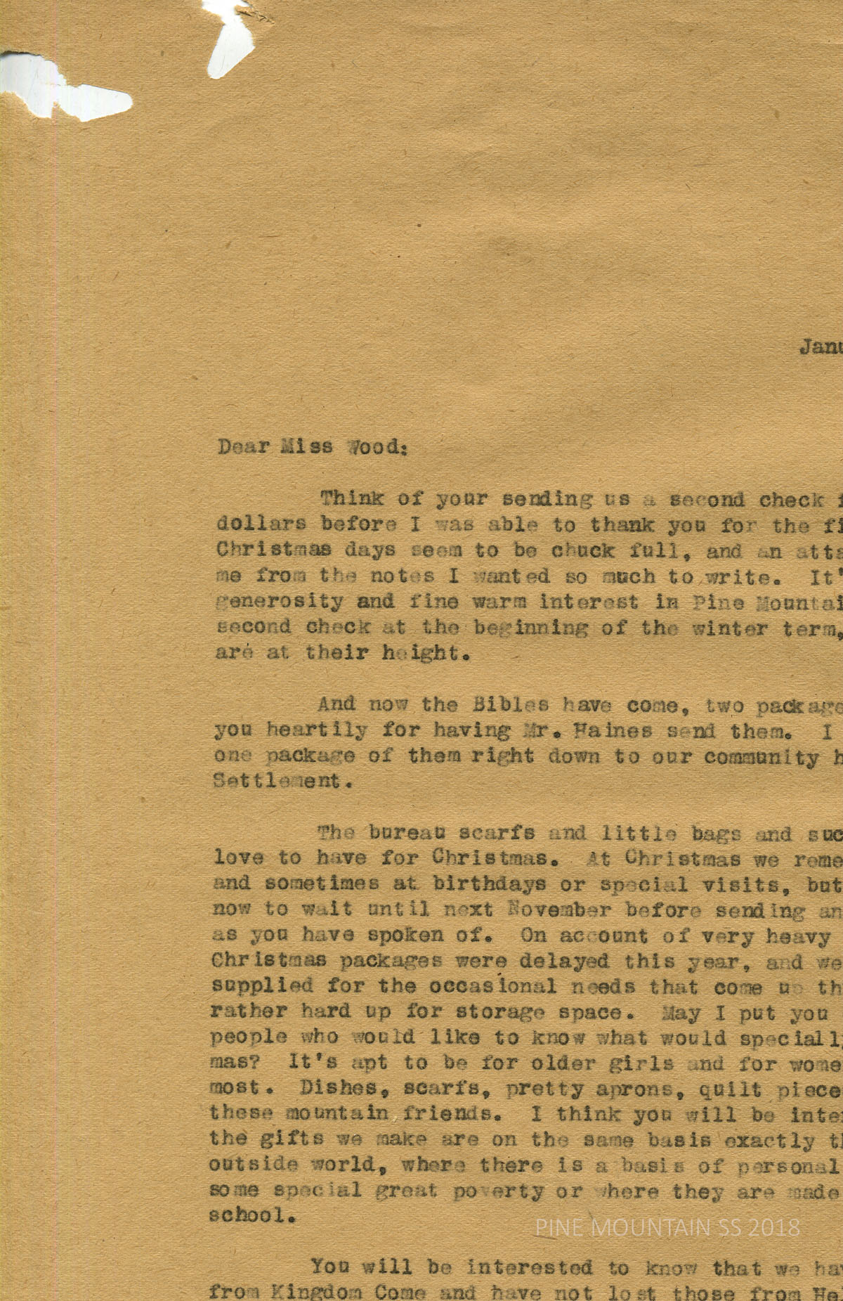 071 Wood, Miss, …[Letter cropped] Probably from Ethel de Long Zande. January. Letter acknowledges the receipt of gifts to the school