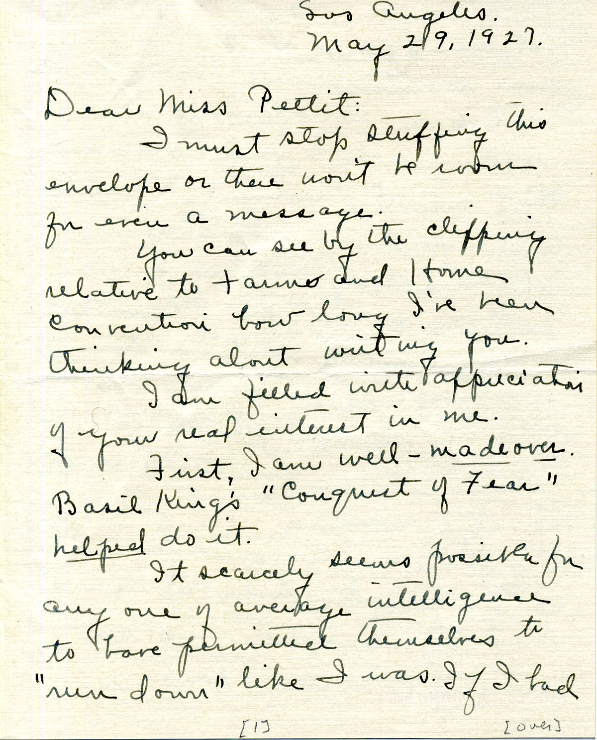 076 Yancey, Jessie O, Los Angeles to Miss Pettit. May 29. Says she is well and gives some thanks to Basil King’s Conquest of Fear. She laments that she did not have PMSS as a nourishing environment and asks Pettit to return to the School as an assistant to Roxy Perkins, the Home Economics teacher and notes she does not require a salary, only board and room. She reminds Pettit that she grew up on a farm and would be interested in working with boys and girls in the Junior Ag. Club. She mentions friends of PMSS and Pettit: Miss Kinkaid, Miss A., Miss Haselette, Miss Akers, Mrs. Mortons.