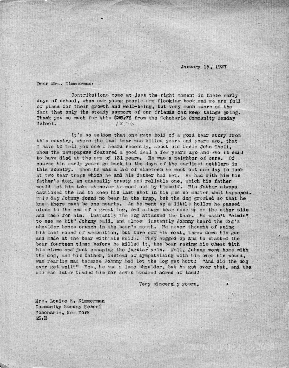 081 Zimmerman, Louise R. Community Sunday School, Schoharie, New York from Ethel de Long Zande. January 15. Zande thanks Zimmerman for her donation and relay a tale about a bear and Uncle John Shell (who reportedly died at the age of 131 years, — later proved untrue). She tells a tall tale about John Shell and the bear that attacked his dog.