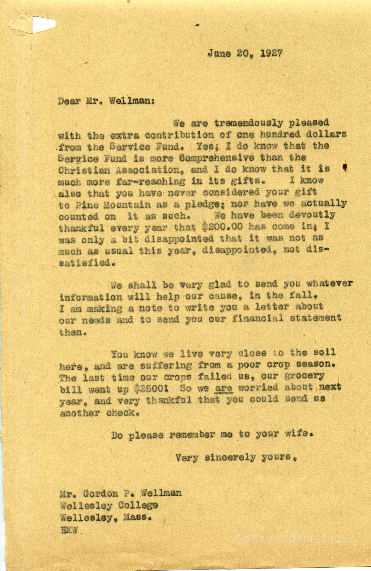043 Wellman, Gordon B., Wellesley College Services Fund, Wellesley, Mass. from Evelyn K. Wells. June 20. Wells advises Wellman that she is well aware of the contribution sources at Wellesley and is grateful for the additional $100 contribution. She agrees to send supporting information to him and notes that “…we live very close to the soil here, and are suffering from a poor crop season, The last tie our crops failed us, our grocery bill went up $2500: So we are worried about next year …”