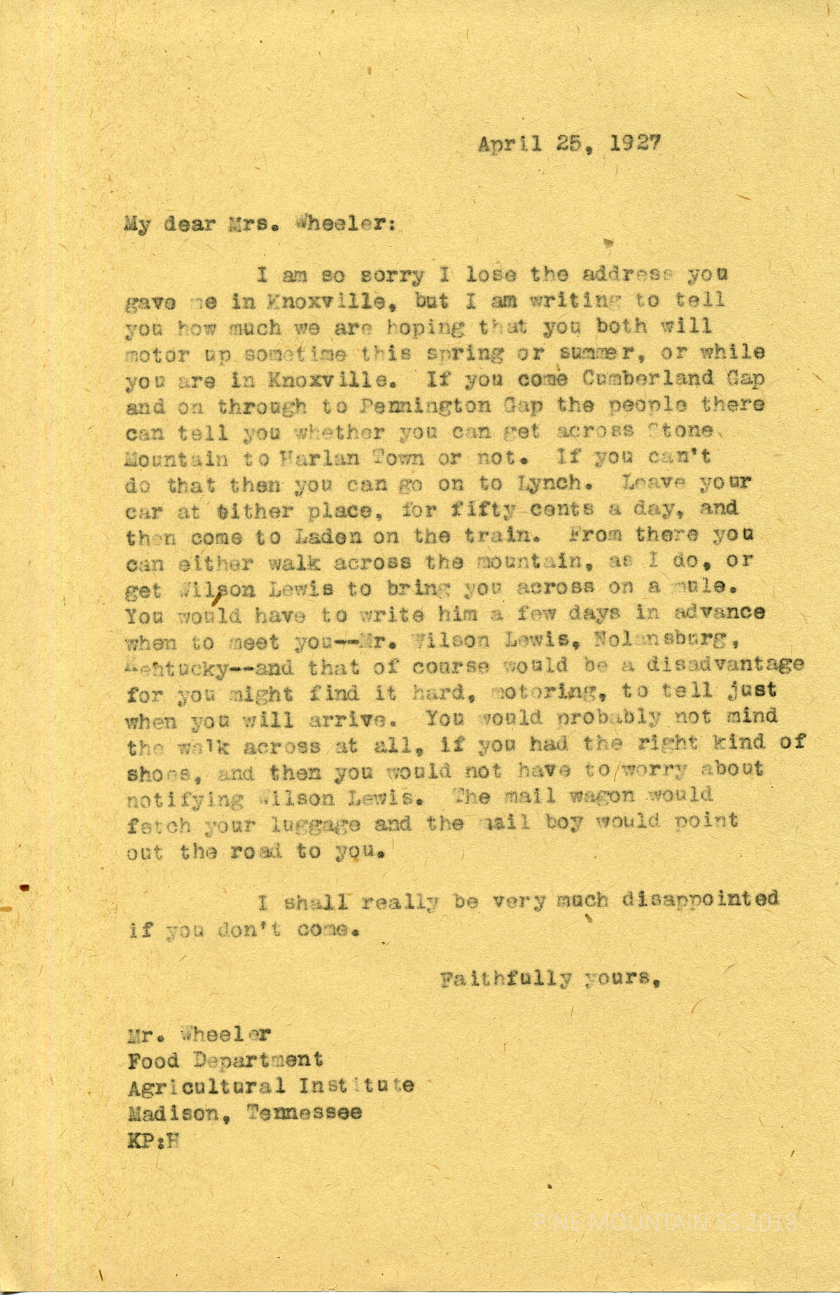047 Wheeler, Mrs., Food Department Agricultural Institute, Madison, TN. from Katherine Pettit. April 25. Pettit Invites Mr. and Mrs. Wheeler to visit PMSS and gives instructions for their travel. If coming through Cumberland Gap and on through Penington Gap, “the people there will tell you whether you can get across Stone Mountain to Harlan Town or not. If you can’t do that then you can go on to Lynch. Leave your car at either place, for fifty cents a day, and then come to Laden on the train. From there you can either walk across the mountain , as I do, or get Wilson Lewis to bring you across on a mule. You would have to write him a few days in advance when to meet you —Mr. Wilson Lewis, Nolensburg, Kentucky — and that of course would be a disadvantage for you might find it hard, motoring, to tell just when you will arrive. You would probably not mind the walk across at all, if you had the right kind of shoes, and then you would not have to worry about notifying Wilson Lewis. The mail wagon would fetch your luggage and the mail boy would point out the road to you.”