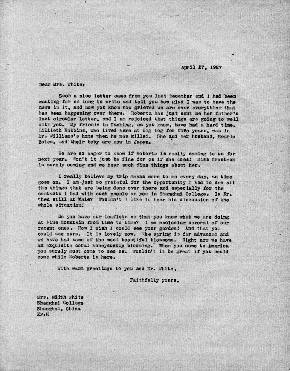 049 White, Mrs. Edith, Shanghai College, Shanghai, China, from Katherine Pettit. April 27. Pettit thanks White for her letter and the news of China. She notes that her friends in Nanking are having a hard time and that Lilliath Robbins (Bates) who worked at Big Laurel was in Dr. Williams’ home when he was killed. She assures White that Robbins and husband, Searle Bates and baby are now in Japan. Pettit remembers her “Around the World” trip and says, “I really believe my trip means more to me every day, as time goes on. “I am just so grateful for the opportunity I had to see all the things that are being done over there and especially for the contacts I had with such people as you in Shanghai College. Is Dr. Chen still at Yale? Wouldn’t I like to hear his discussion of the whole situation?” Pettit describes the garden at PMSS and hopes to see Roberta [Mrs. Roberta Parke, a teacher] …. and Miss Grosbeck [?] as workers next year.
