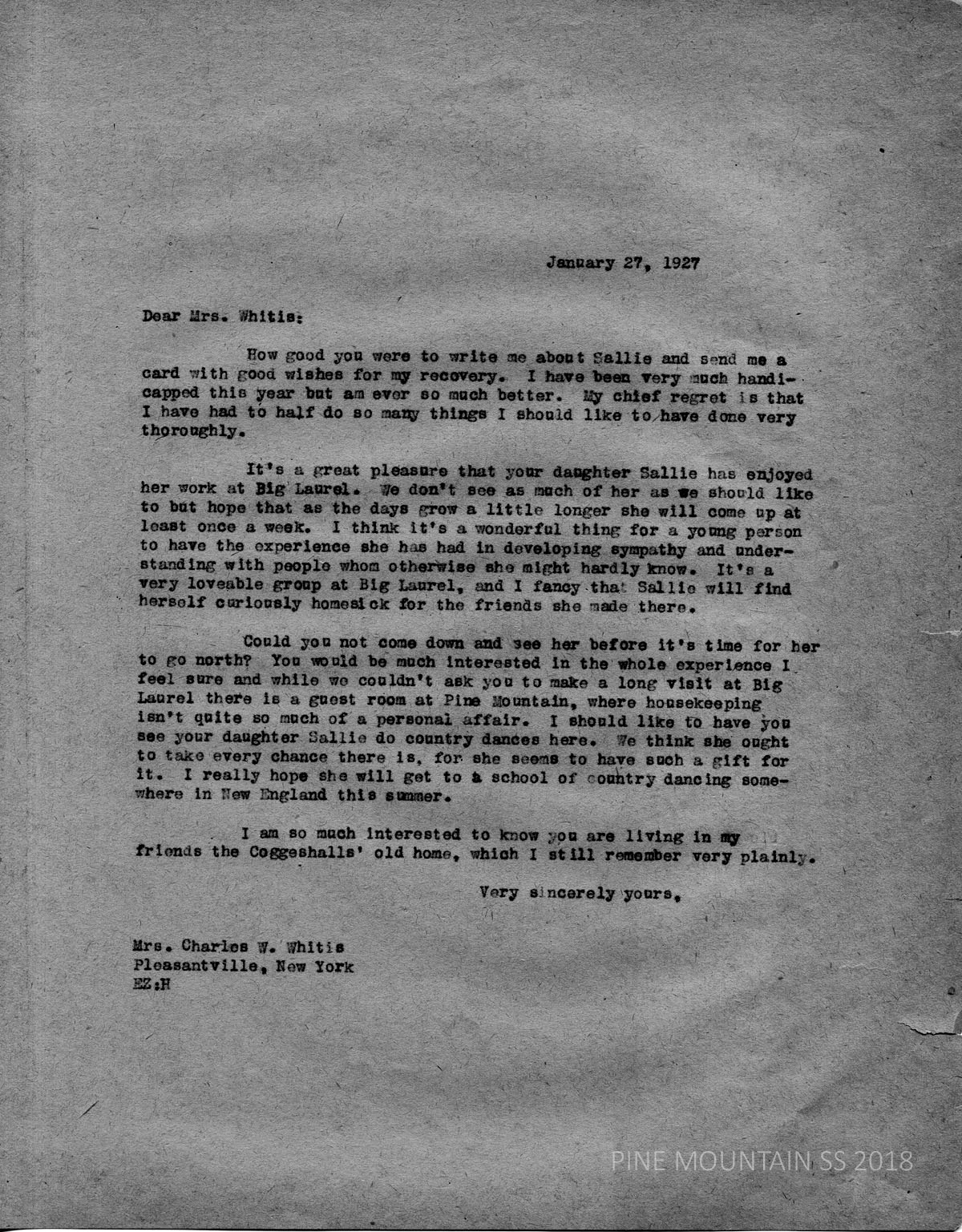 050 White, Mrs. Charles W. White, Pleasantville, New York. from Katherine Pettit. January 27. Pettit appreciates news of Sallie White, daughter of Mrs. White, who is working at Big Laurel (volunteer). Pettit notes how much she enjoyed seeing Sallie dancing the country dances.