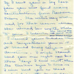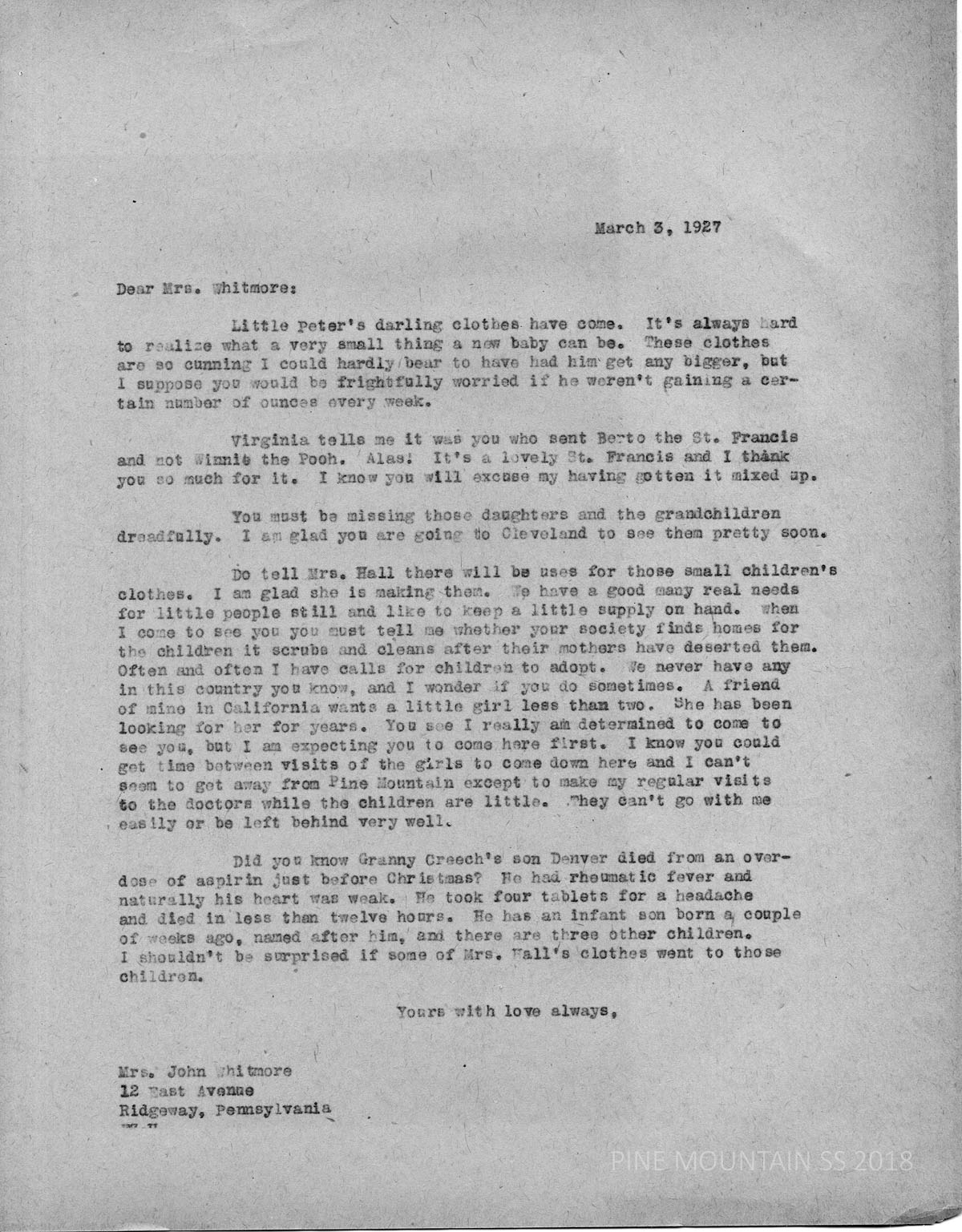 054 Whitmore, Mrs. John, Ridgeway, PA, from Ethel de Long Zande. March 3. Thanks Mrs. Whitmore for clothes for Little Peter [?]. Asks that Mrs. Hall also be thanked for the clothes. Interesting notes on PMSS policy and activity regarding the adoption of abandoned children. Ethel laments the difficulty of taking children along for her weekly medical check-ups. Notes the death of Denver Creech, Granny Creech’s son from an aspirin overdose. His rheumatic fever led to a weak heart. “He took four tablets for a headache and died in less than twelve hours, said Zande. He had an infant son.