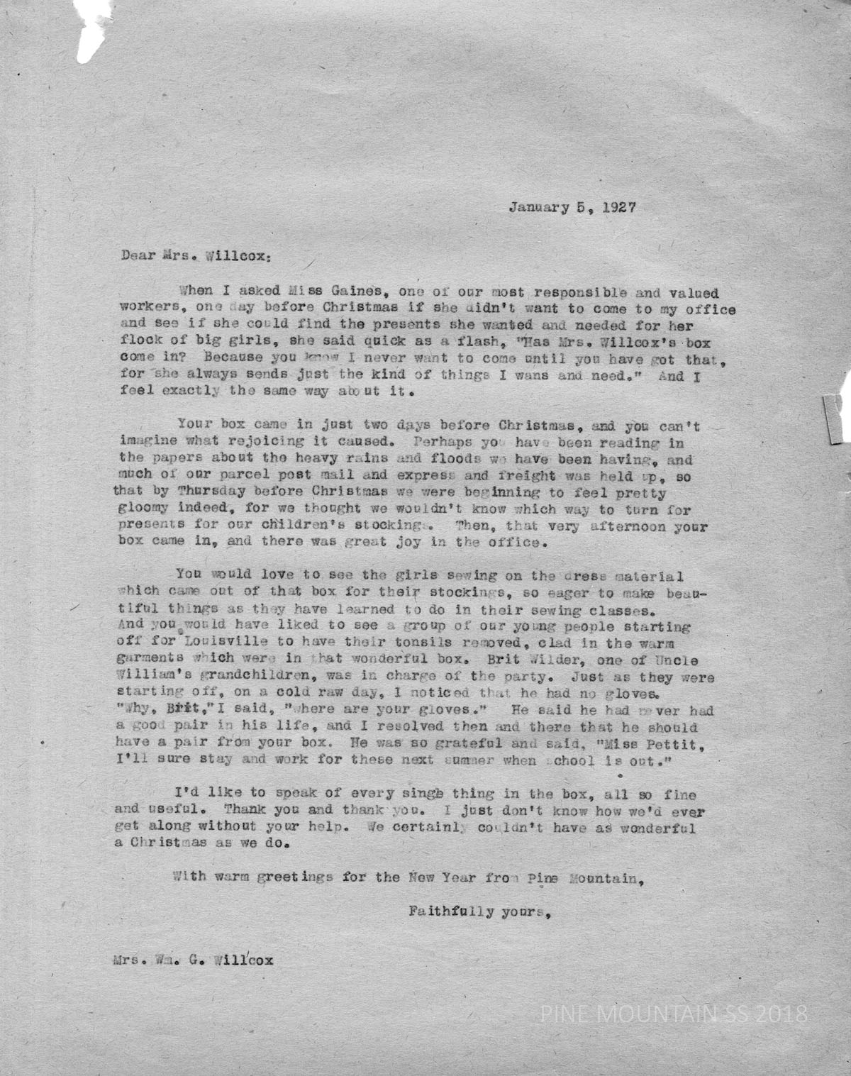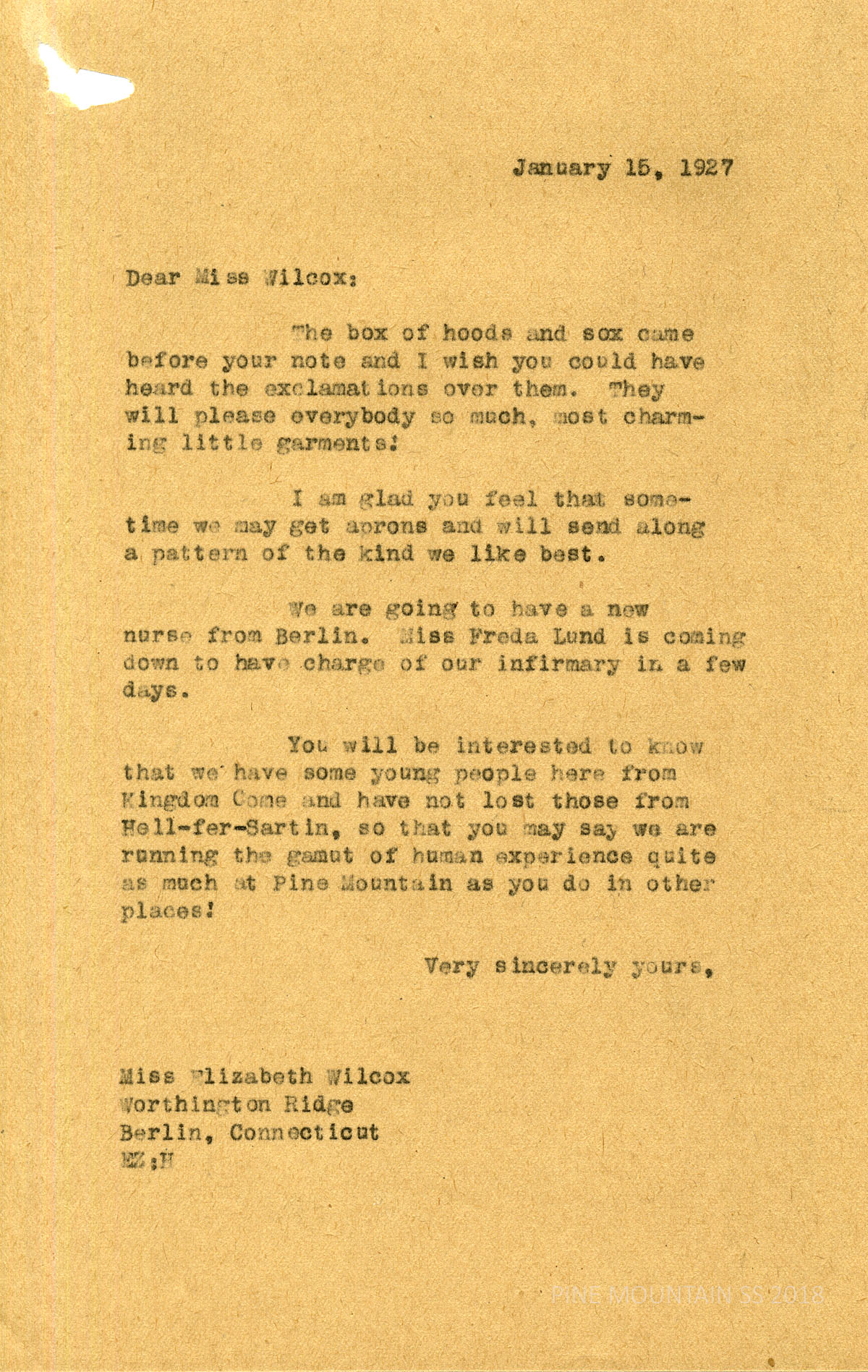 055 Wilcox, Elizabeth, [Mrs. William G.] Berlin, Connecticut, from Ethel de Long Zande. January 15. Thanks for the “hootd and sox that came with a note from Elizabeth. Zande writes, “You wil be interested to know that we have some young people here from Kingdom Come and have not lost those from Hell-fer-Sartin, so that you may say we are running the gamut of human experience quite as much at Pine Mountain as you do in other places!”