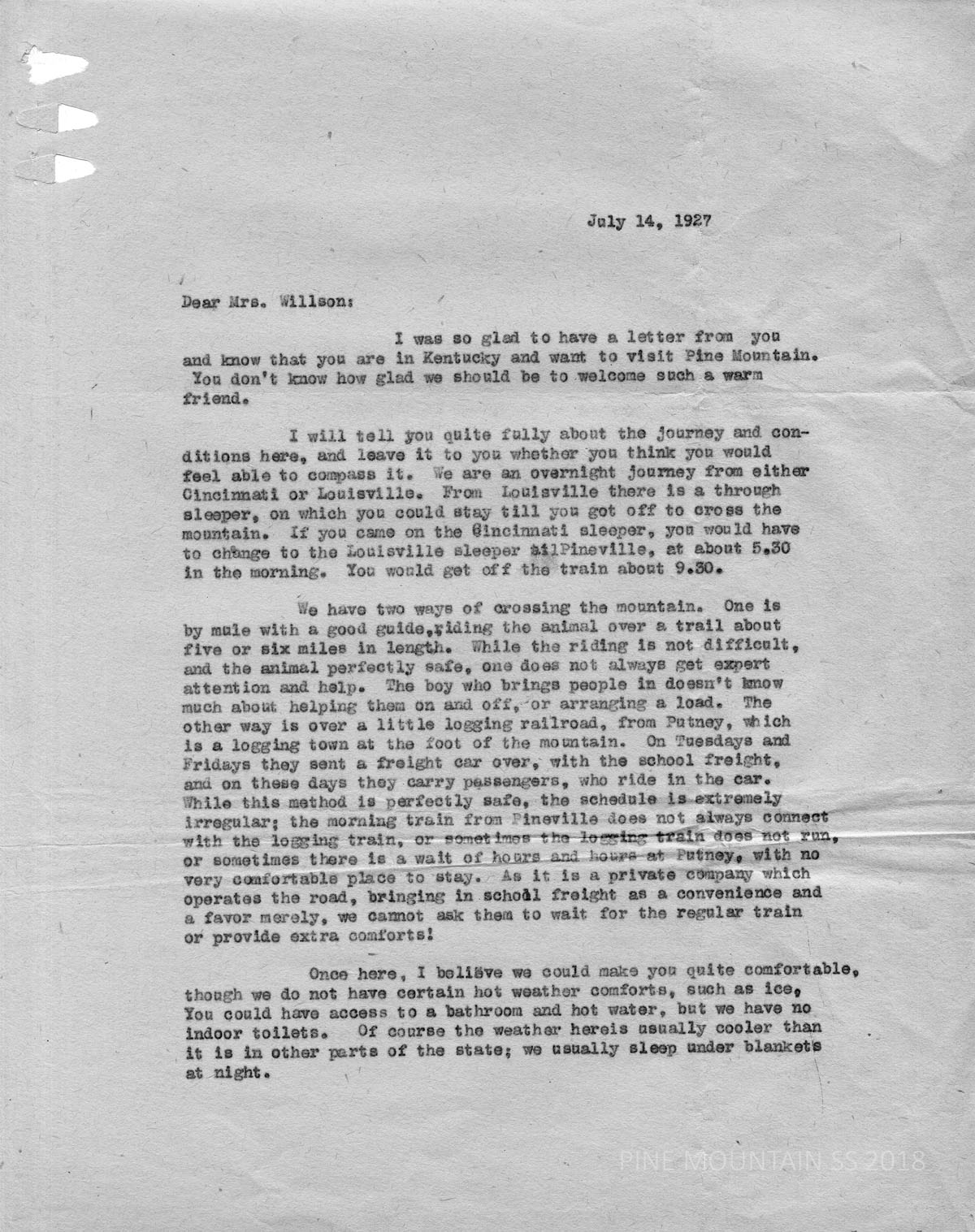 059 Willson, Mrs. C,C, Beaumont Inn, Harrodsburg, KY. from Katherine Pettit. July 14. Miss Pettit anticipates a visit from Mrs. Willson and gives her directions for crossing the mountain. The directions are comprehensive as is a description of living on campus. (2 pages)