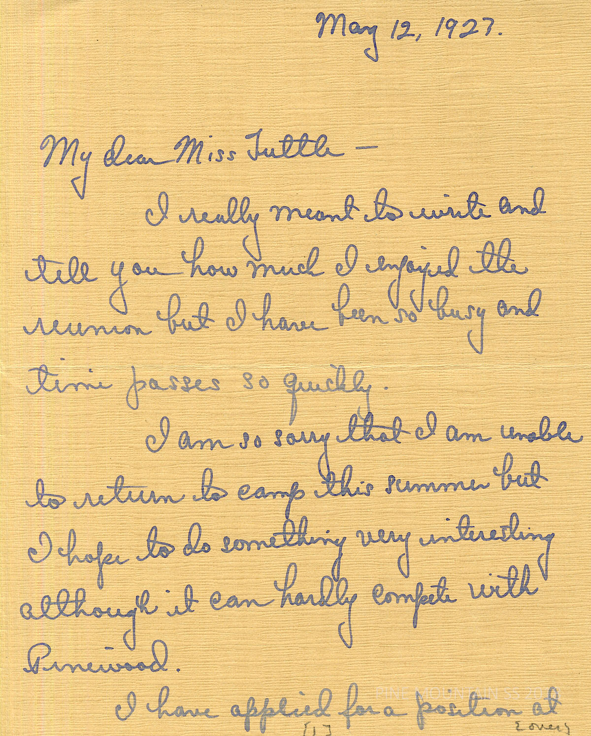 065 Wilson, Barbara, [regarding] APPLICATION for Pine Mountain Settlement School, Inc., May 12, 1927. Himedale, IL. to Mrs. Gertrude Tuttle. May 12. Requests a referral to Pine Mountain and notes that she will not be returning to Pinewoods the next summer. (3 pages)