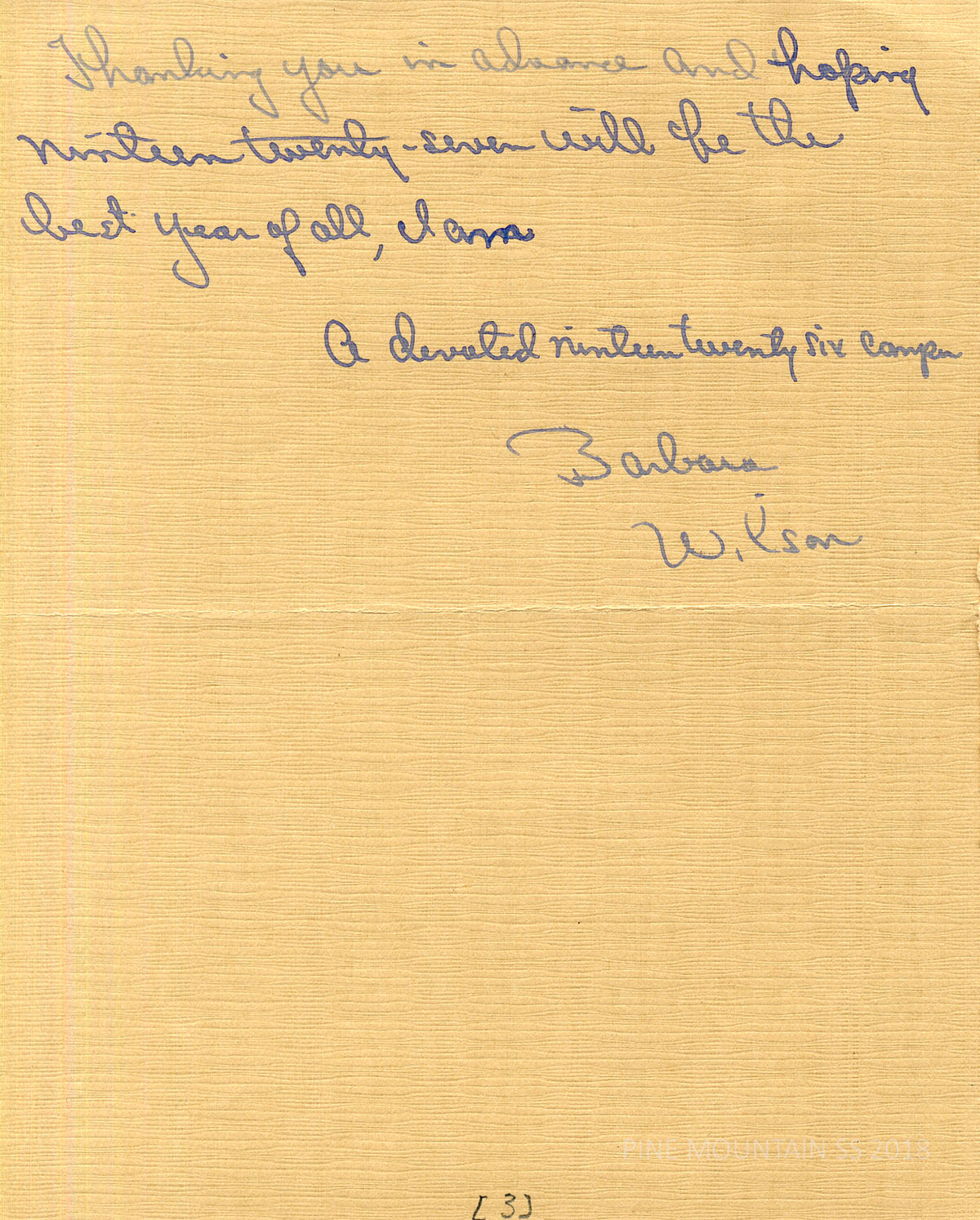 063 Wilson, Barbara, APPLICATION BLANK. Pine Mountain Settlement School, Inc., May 12, 1927. Himedale, IL. Miss Wilson requests a position at the School and describes her interest as follows: “I believe that Pine Mountain interests me because of the indirect contact that I have always had with the settlement. My church, as well as my own family, have been supportive of Pine Mountain for a number of years. For two years I spent my summer at Pinewood Camp where I heard much of Mrs. Zande and her work. It seems that Pinewood and Pine Mountain were installed about the same time and so there is a friendly feeling and interest for the Settlement. Mrs, Zande wrote we had a lovely letter which was printed in our yearbook and so I feel that we are the best of friends although we have never see each other. ..” (2 pages)
