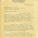 042 Wellman, Gordon B., Wellesley College Services Fund, Wellesley, Mass. to Evelyn K. Wells. June 14. Wellman responds to Wells nudge for additional contribution and notes the many demands on the Services Fund. He also notes that “even Yenching, our Sister College expects no set sum from year to year.” Suggests that Wells come before the Committee in autumn “with information, financial statements and the needs.” Wellman then adds he is sending $100 dollars more. (2 pages)