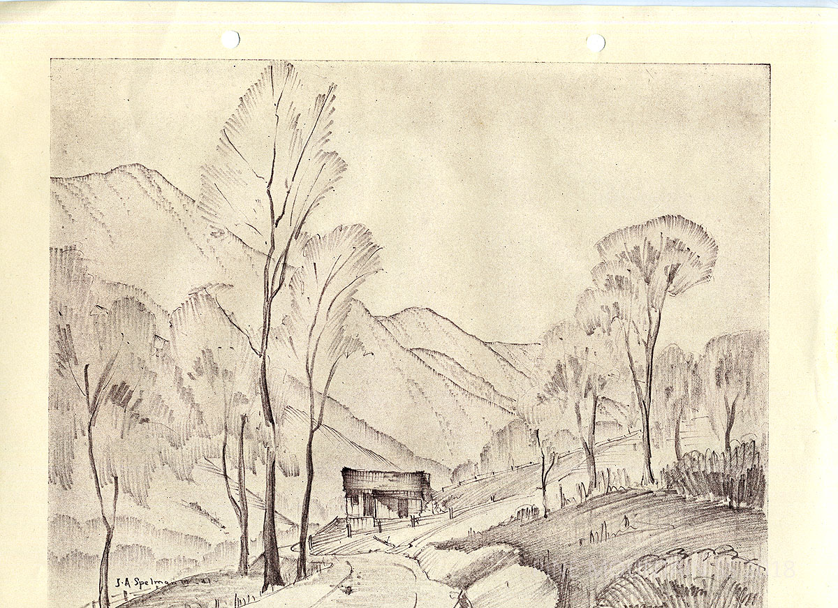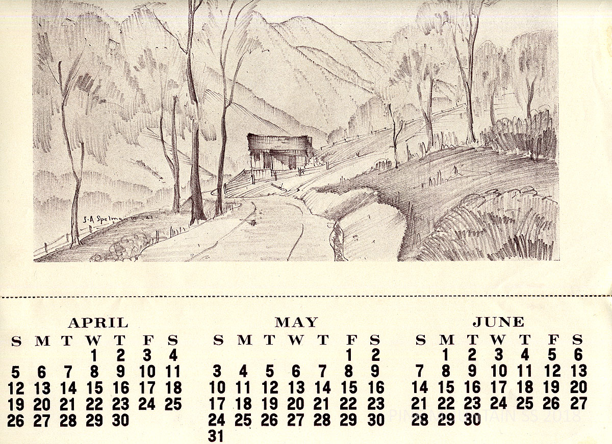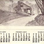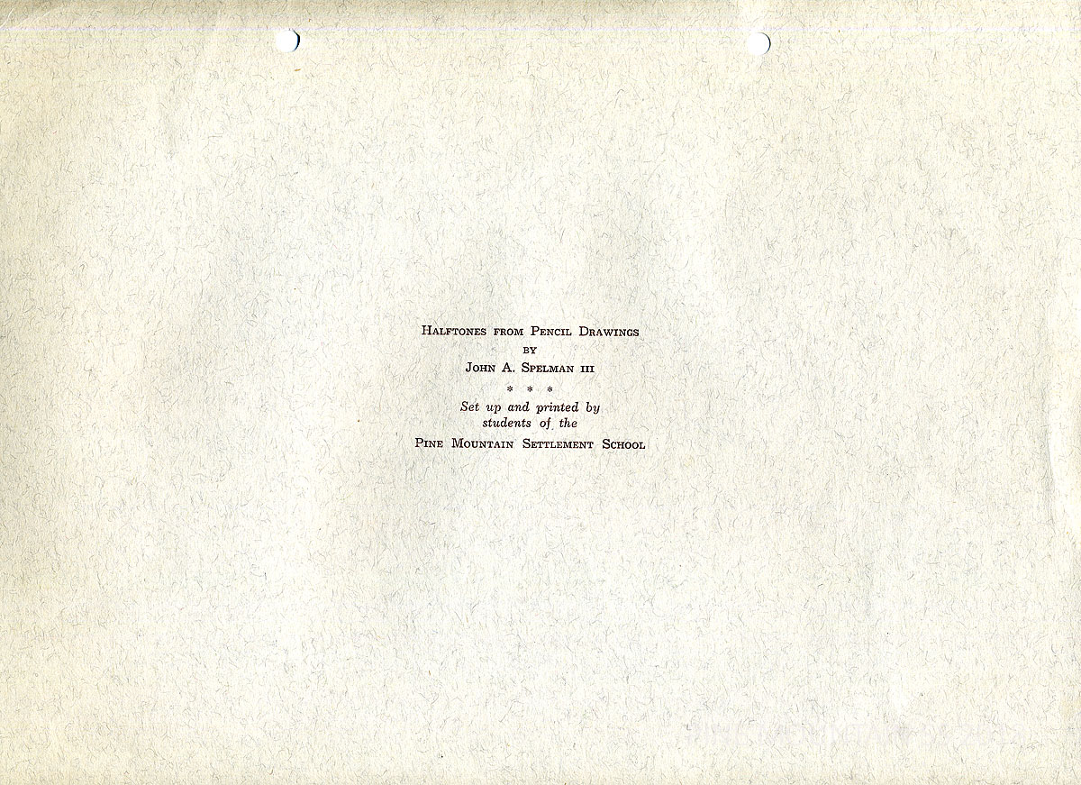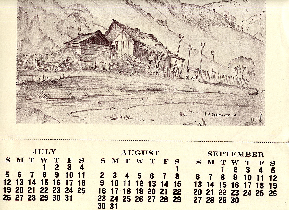 The 1942 Calendar printed by the Pine Mountain Settlement School Print Shop is the design of John A. Spelman III and contains his drawings. The Scenes of the rural countryside with its wooden homes and barns became a signature subject for Spelman who served as the Art instructor at the School in the late 1930s. The art of Spelman is easily recognized for its lyrical style and focus on architectural forms.