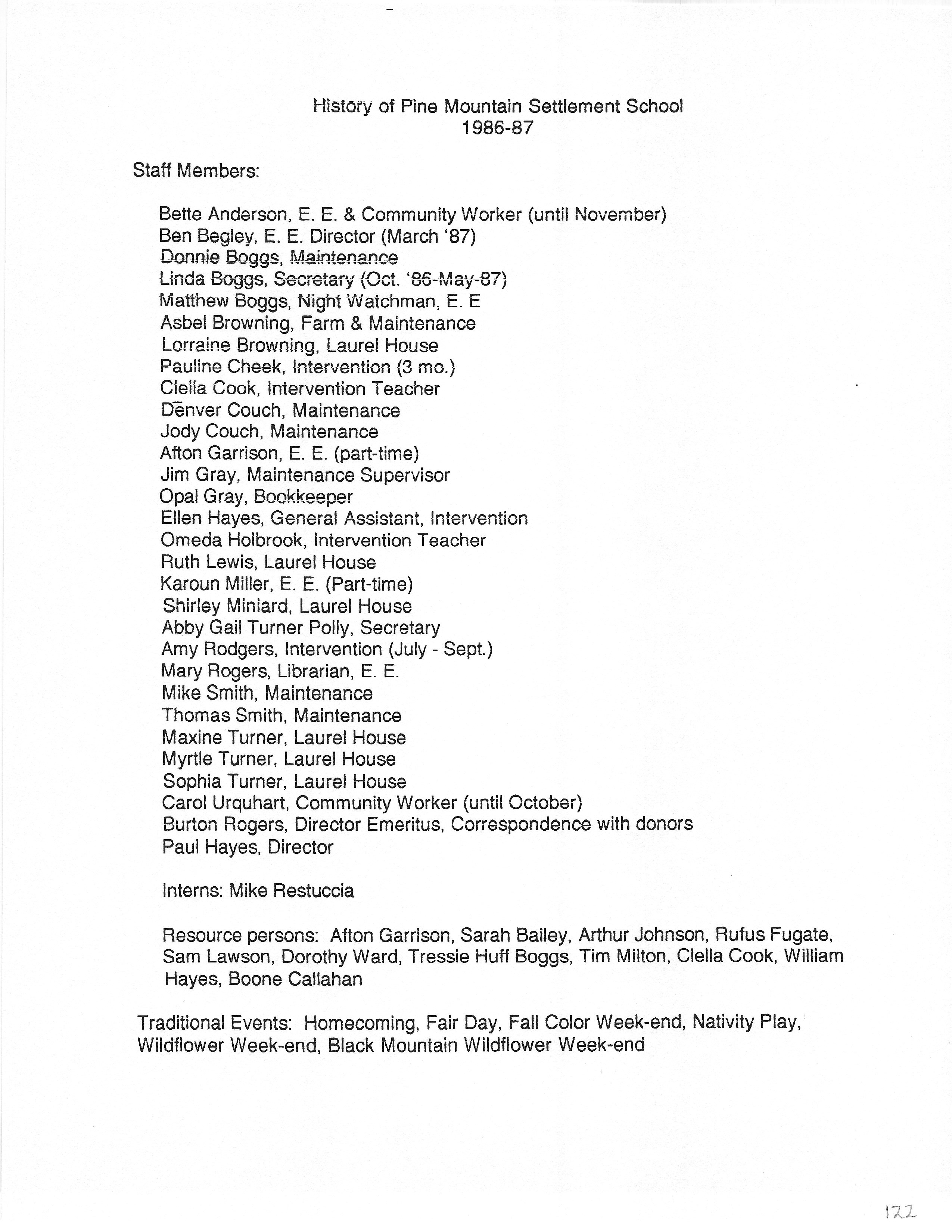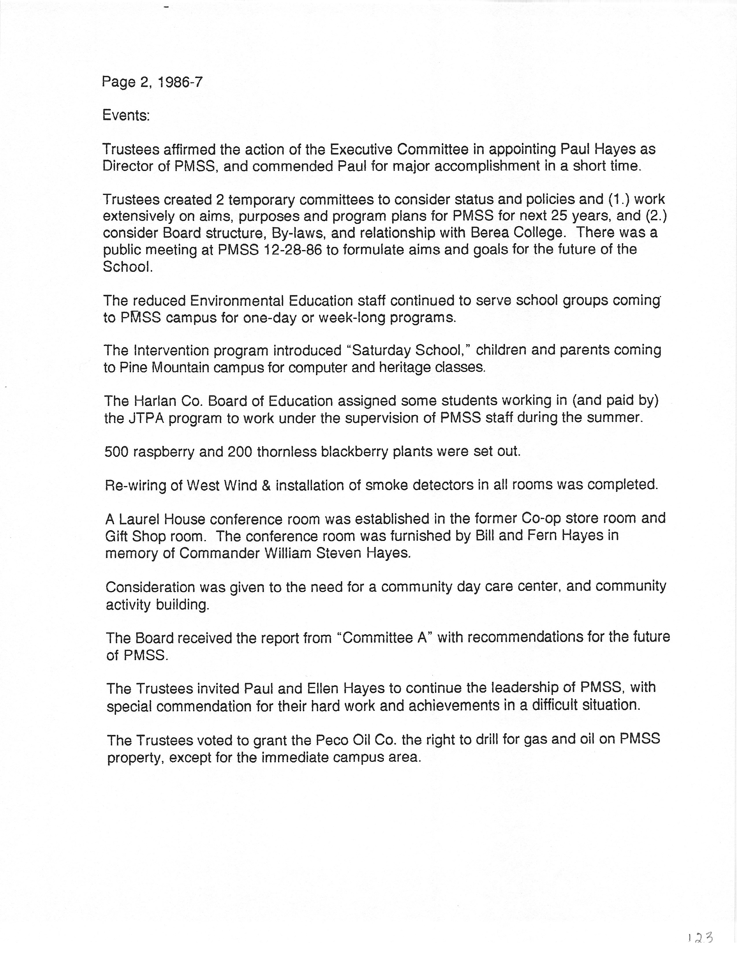 Trustees created 2 temporary committees to consider status and policies and (1.) work extensively on aims, purposes and program plans for PMSS for next 25 years, and (2.) consider Board structure, By-laws, and relationship with Berea College. There was a public meeting at PMSS 12-28-86 to formulate aims and goals for the future of the School.