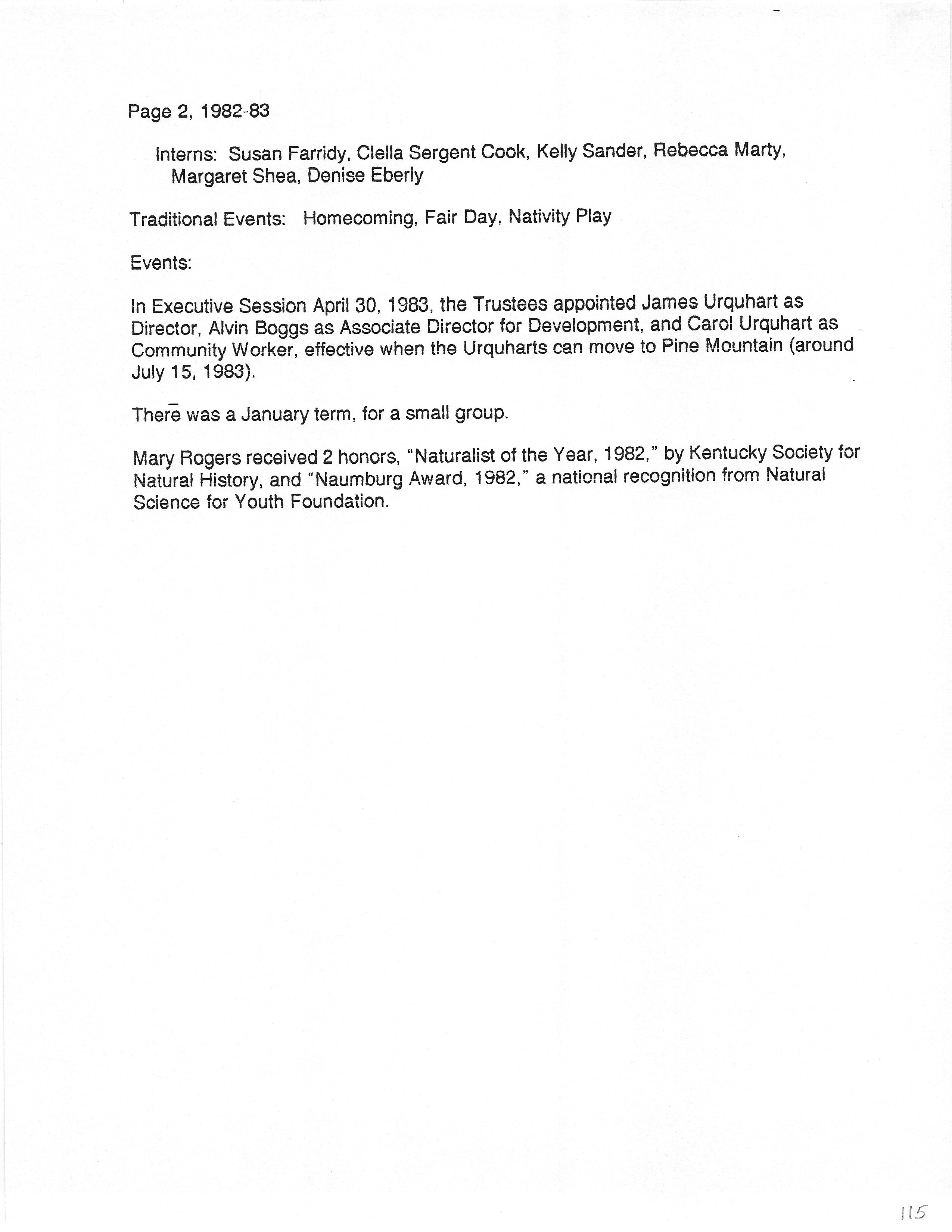 In Executive Session April 30, 1983, the Trustees appointed James Urquhart as Director, Alvin Boggs as Associate Director for Development, and Carol Urquhart as Community Worker, effective when the Urquharts can move to Pine Mountain (around July 15, 1983).