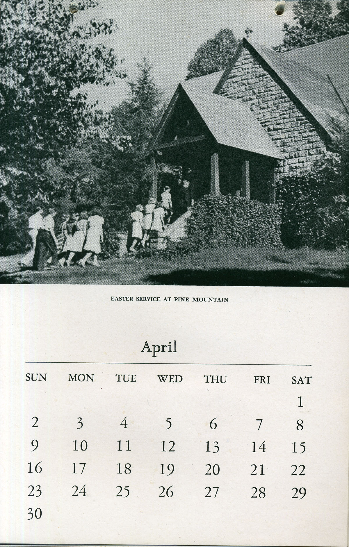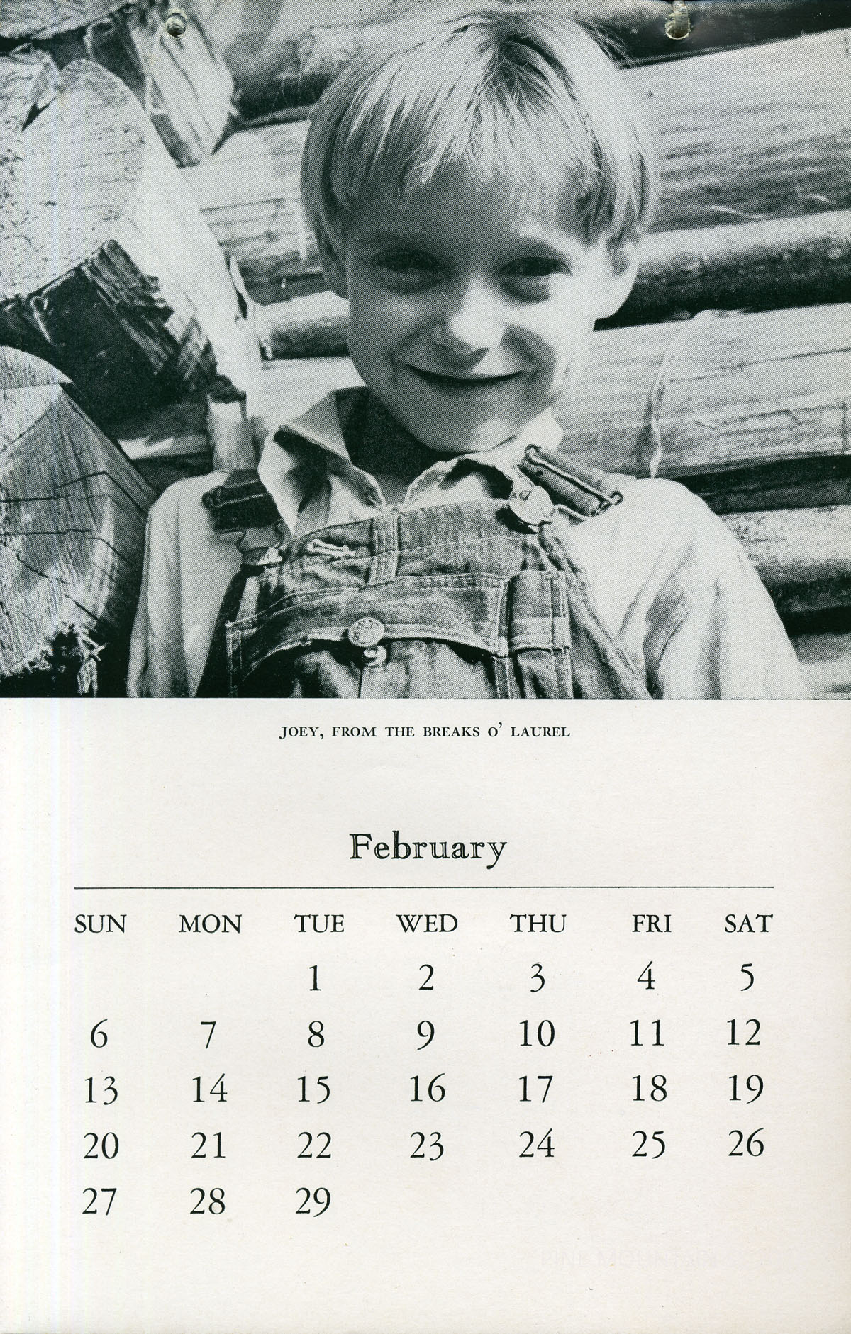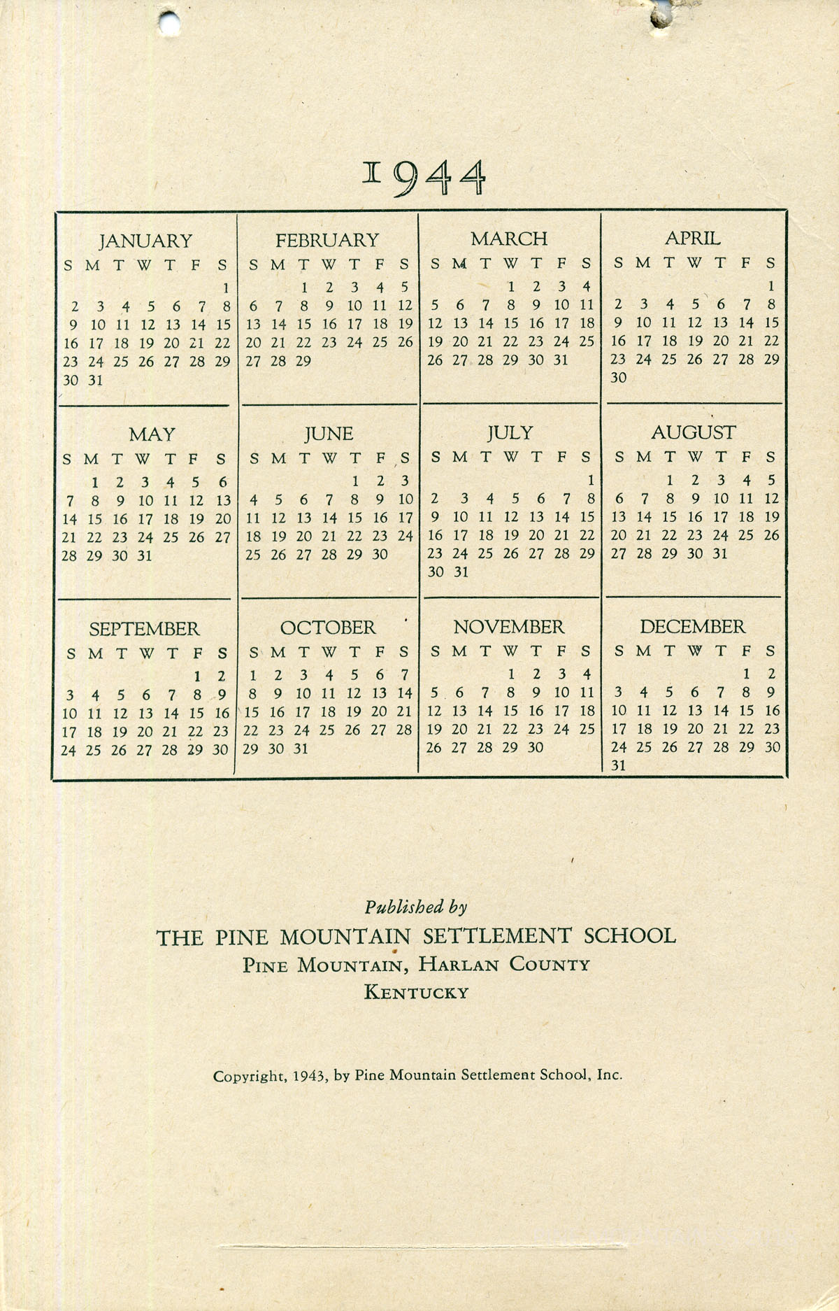 The 1944 Calendar features views of Pine Mountain Settlement School as well as the surrounding community in the early 1940s. The photographs are by Arthur Dodd the staff photographer and Principal and instructor at the School. During his tenure at the School.”Dodd,” as he was called, created many images that were used in publicity and promotion of the institution.