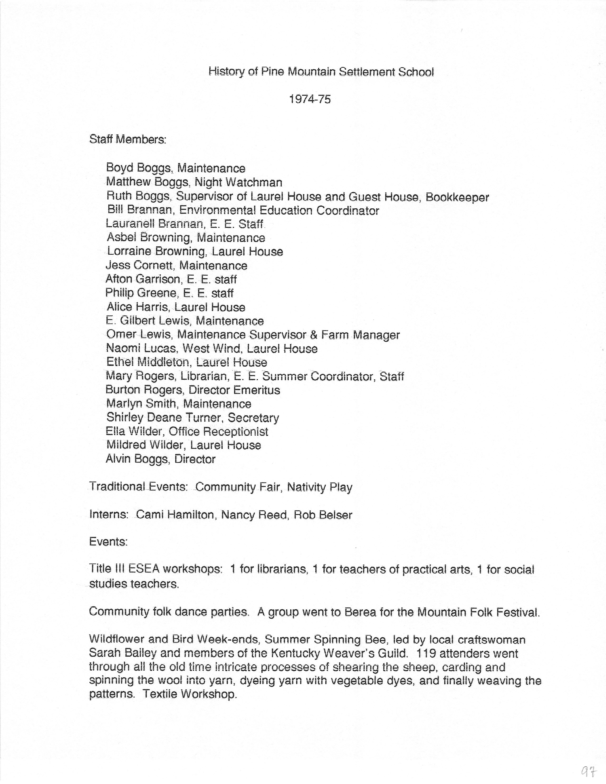 Tags: History PMSS summary 1974-1975, staff, interns, events, Title III ESEA workshops, folk dancing, spinning bees, textile workshops, volunteers, homecoming, facilities usage, landmarks, donation offer, trustees