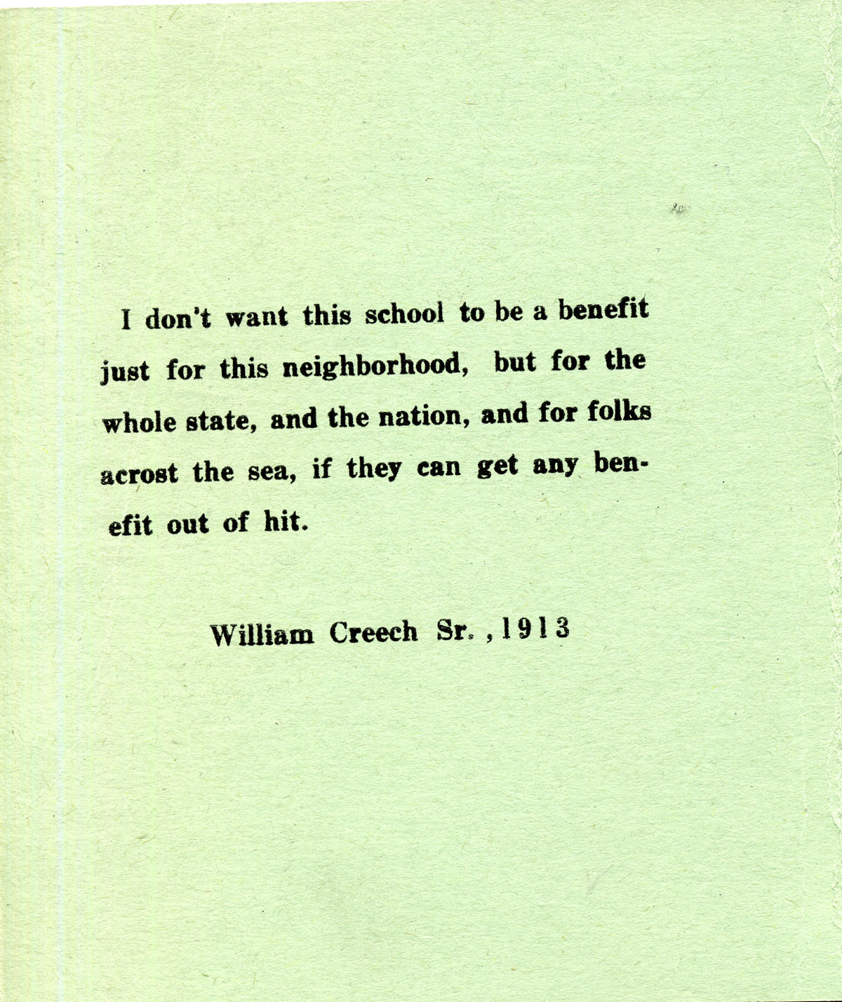 I don’t want this school to be a benefit just for this neighborhood, but for the whole state, and the nation, and for folks acrost the sea, if they can get any benefit out of hit.