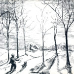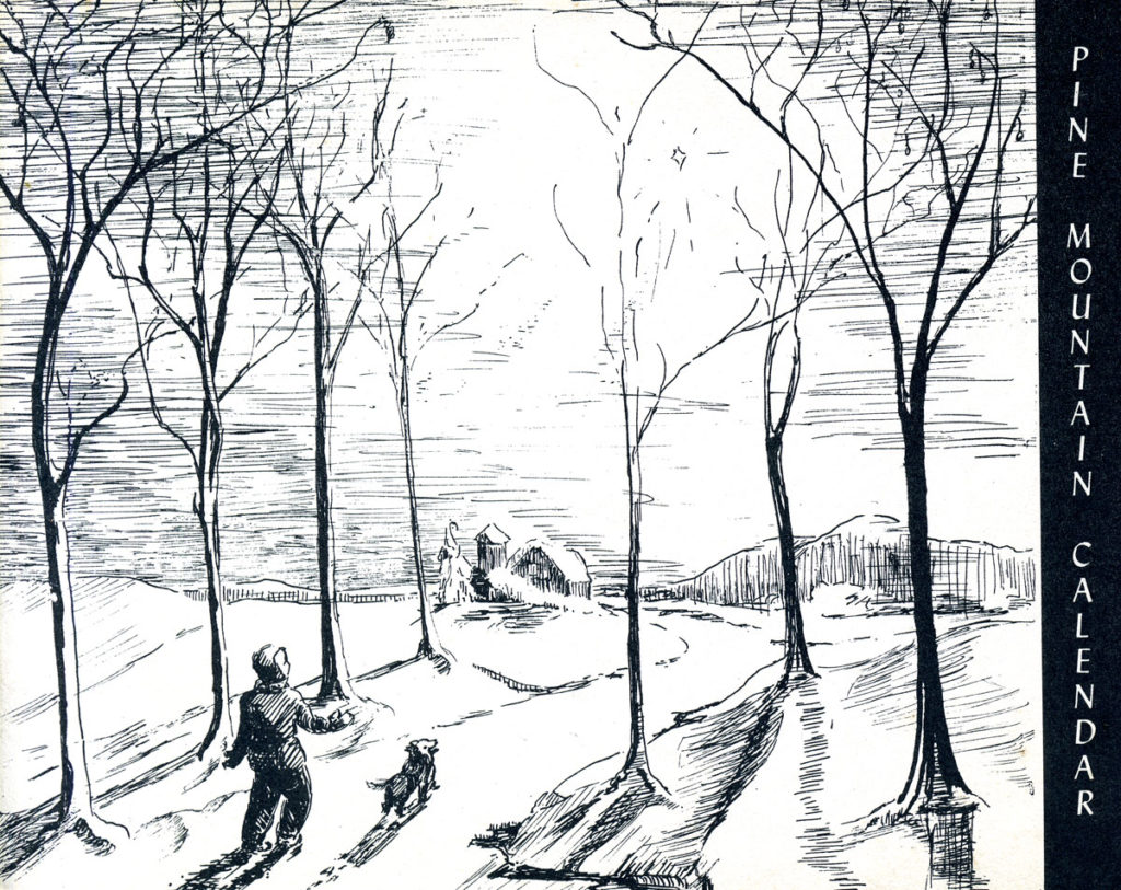 The 1957 PMSS Calendar is a quarter folded card format. The design and the drawing is by Mary Rogers, staff at Pine Mountain Settlement School. Created during the Community School years, it captures the quiet walks on the school grounds following the departure of the boarding students.