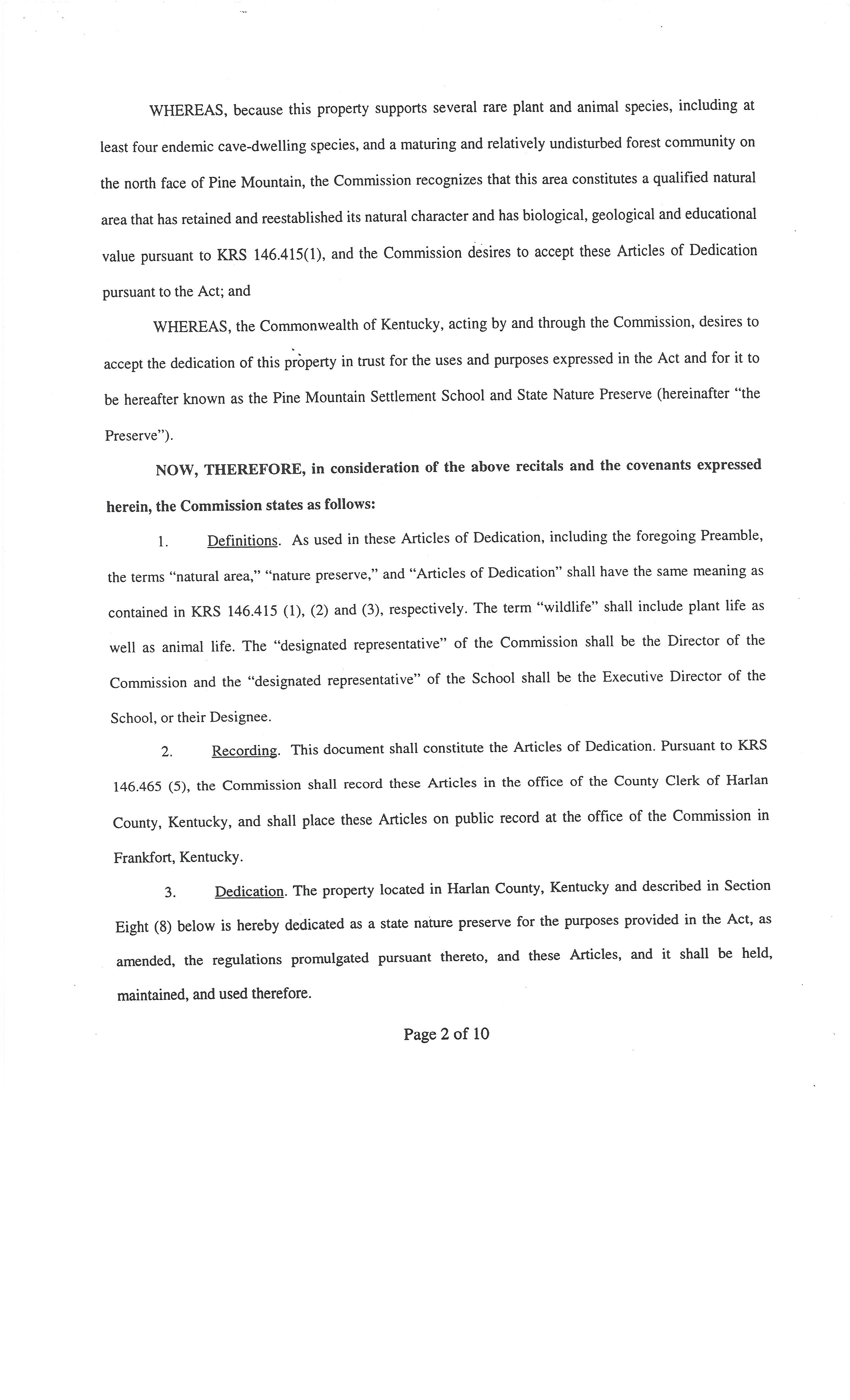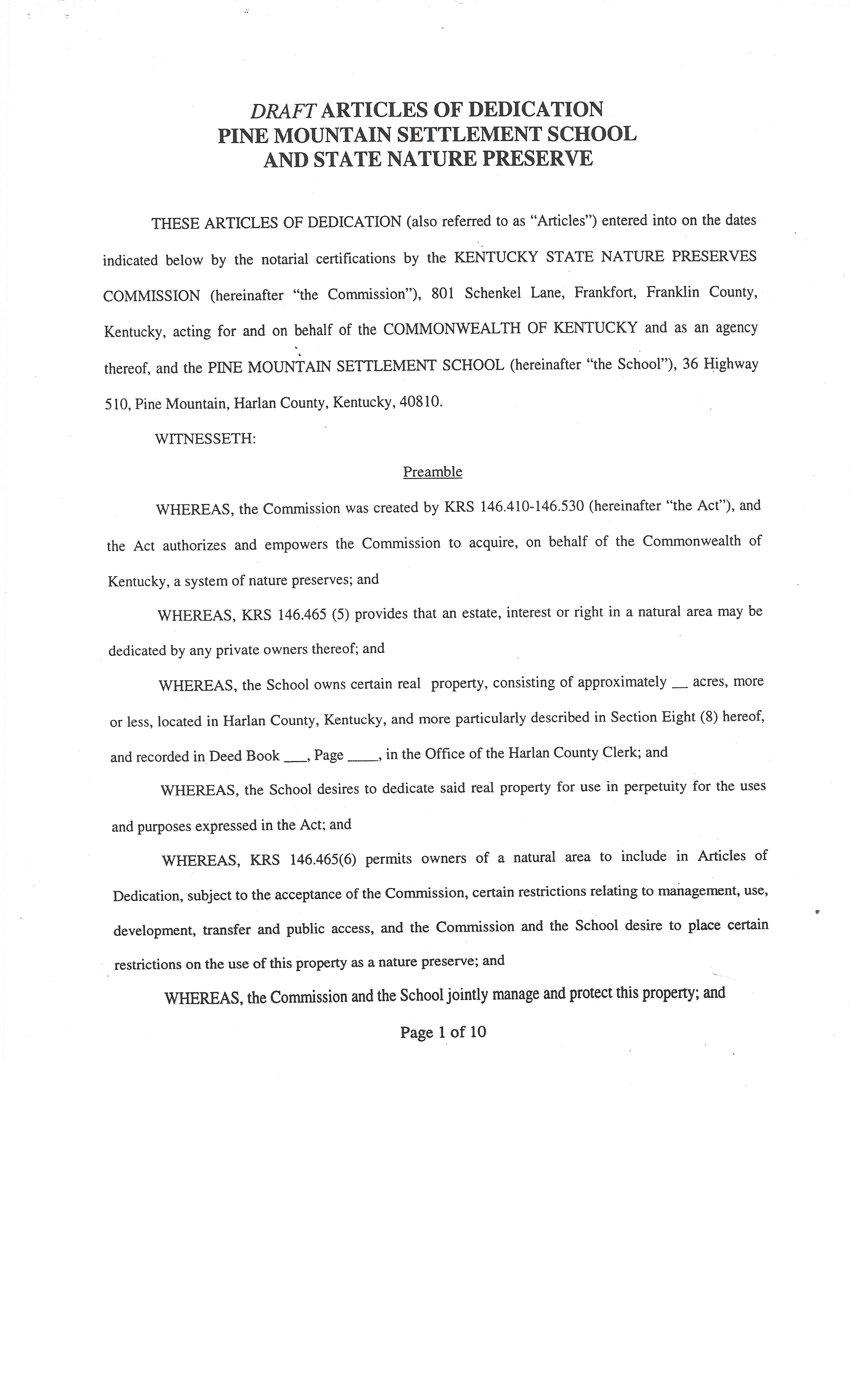 GALLERY: GOVERNANCE Articles of Dedication Pine Mountain Settlement School and State Nature Preserve (Draft)