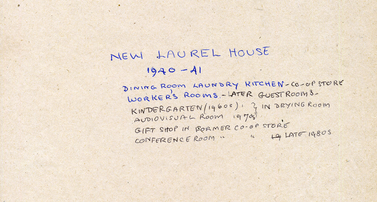 The new Laurel House contained the elements that were critical to the function of the older building, but the design was altered from the original plan. The plan included a Dining Room, Kitchen and Laundry, but later adjustments to the plan or alterations in later years included space for Worker’s Rooms, a Co-op Store, Kindergarten classroom (1960s) and Audio-visual Room (1970s), Gift Shop in the former Co-op Store and in the late 1980s, a Conference Room in the original Co-op Store room.