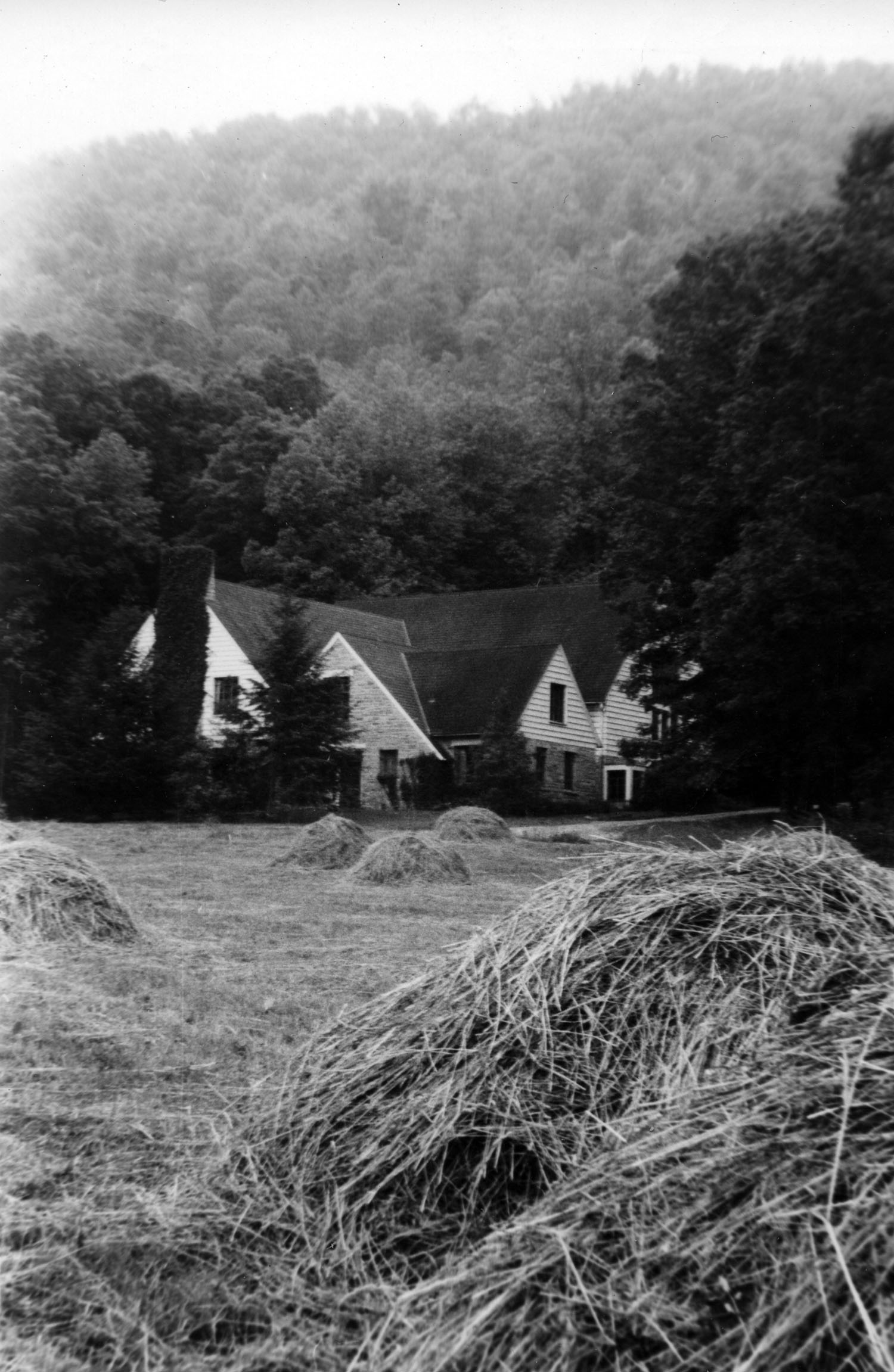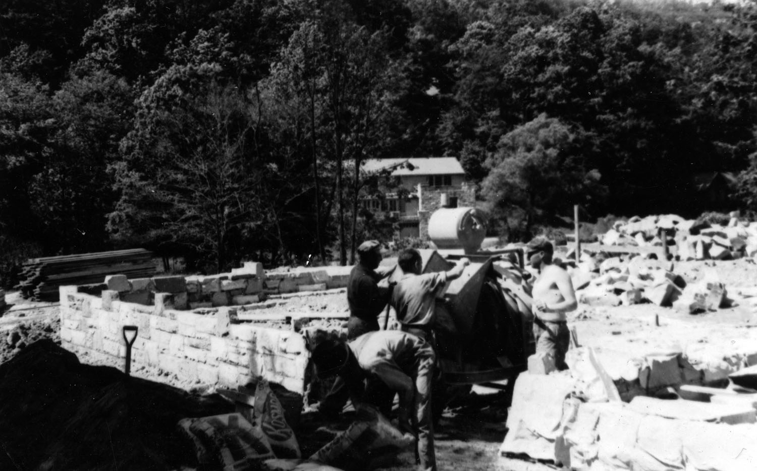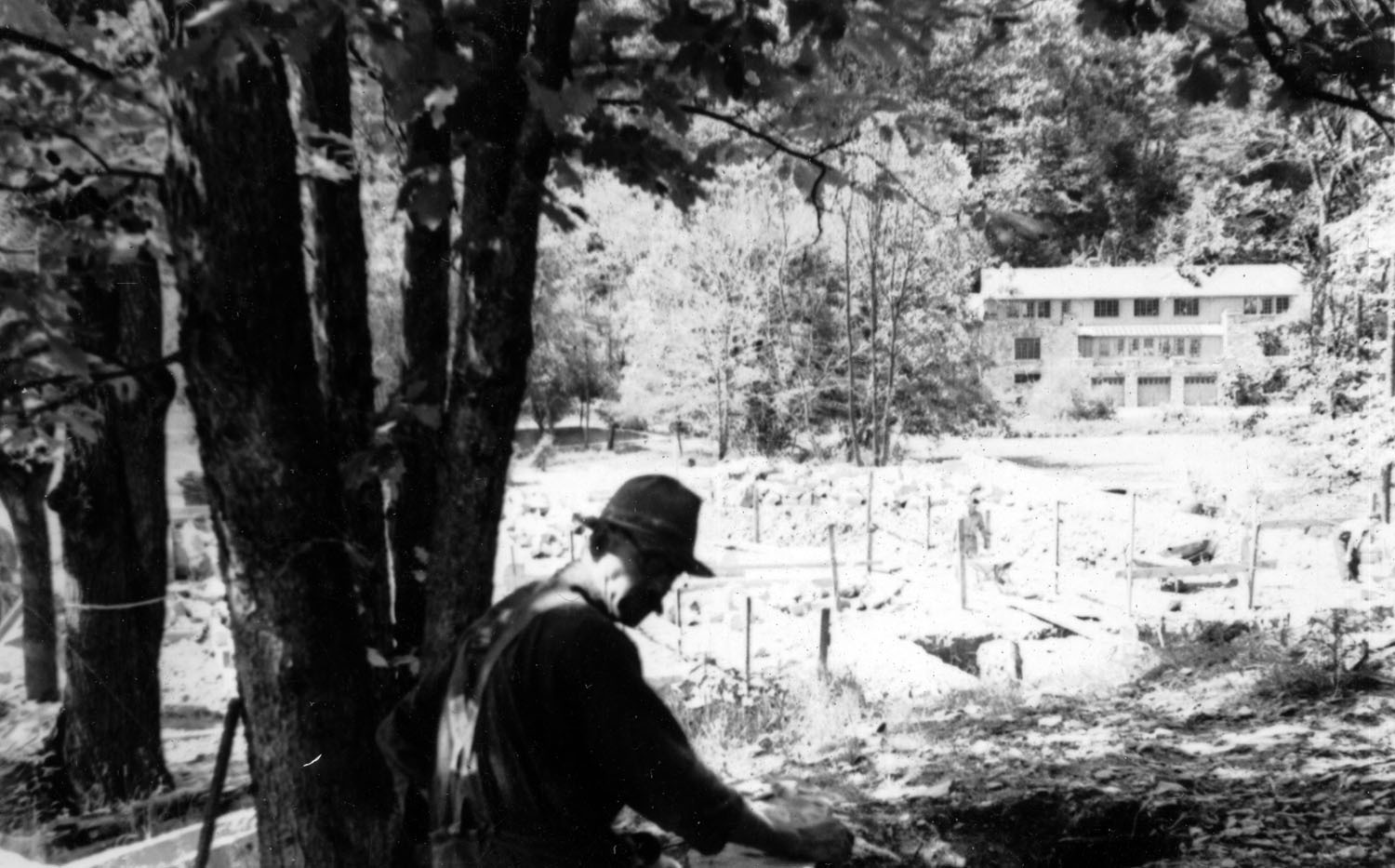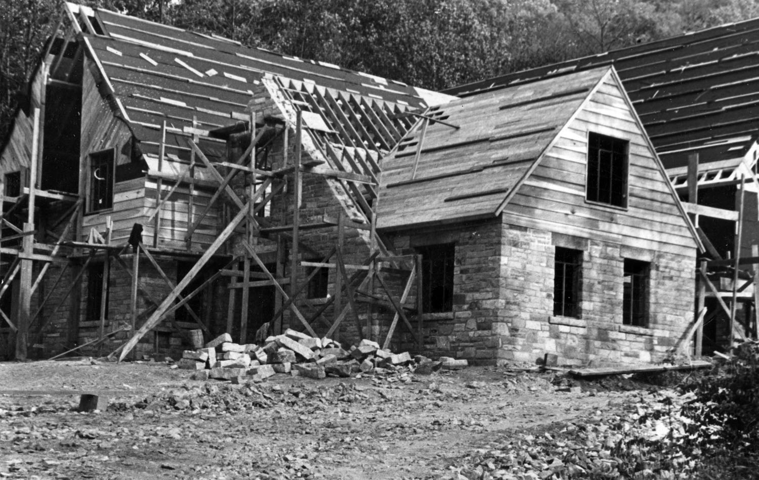 Laurel House — partly of stone and partly of wood construction. The foundation stone and stone used in the first floor were quarried from campus rock formations. The quarrying began in Saw Mill Hollow. Later the workmen hauled stone from the rock ledges beyond the dairy barn, and other parts of the campus. Flagstones for use in the terraces and halls were secured by former student Arney Hall.