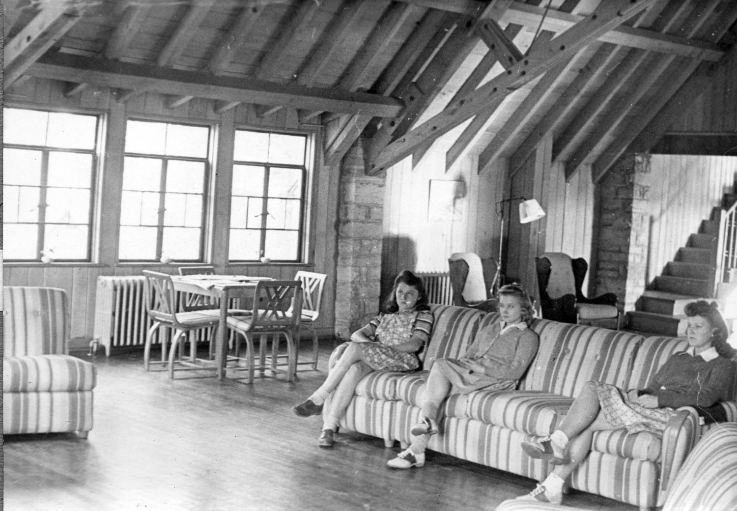 Both buildings are the design of Mary Rockwell Hook, the School’s lead architect. Built in 1940 to replace the destroyed building, Laurel House II was constructed on the same site as the earlier building, but the two structures are very different in design. Theda Howard’s description of six gables captures the more angular nature of the new Laurel House. It is a well-constructed building and the value of the new building and the equipment in 1940 was estimated to be $44,746.00, making the structure, again, the most expensive building at the School. The earlier Laurel House I had a valuation of $17,024.68 in 1926. The new building, like the old one, is of stone and wood construction. The ground floor is of natural stone, similar to that found in the Chapel and in Draper Industrial Building. The second floor is of wood frame construction. A concrete enclosure contains the coal-bin and furnace for the building.