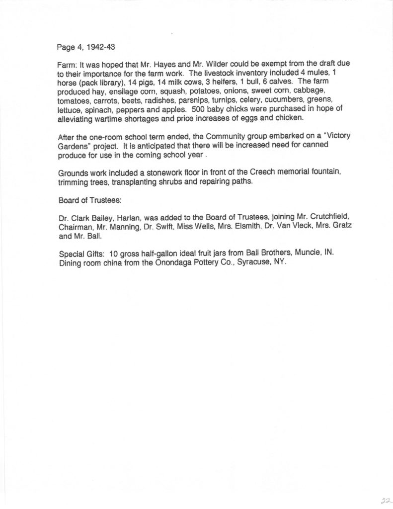 Farm: It was hoped that Mr. Hayes and Mr. Wilder could be exempt from the draft due to their importance for the farm work. The livestock inventory included 4 mules, 1 horse (pack library), 14 pigs, 14 milk cows, 3 heifers, 1 bull, 6 calves. The farm produced hay, ensilage corn, squash, potatoes, onions, sweet corn, cabbage, tomatoes, carrots, beets, radishes, parsnips, turnips, celery, cucumbers, greens, lettuce, spinach, peppers and apples. 500 baby chicks were purchased in hope of alleviating wartime shortages and price increases of eggs and chicken.