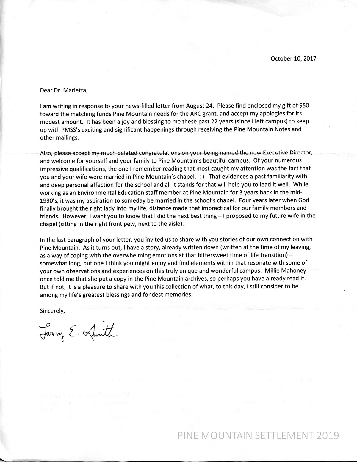 Smith’s letter in response to PMSS Director Geoff Marietta, October 10, 2017; enclosing gift toward matching funds for ARC grant; enjoyed PMSS mailings; congratulated Marietta for being named Executive Director; comments on Marietta’s marriage in the Chapel; Smith worked at PMSS for 3 years in the mid-1990s; in response to Marietta’s invitation for alumni to share their stories, Smith offers his story “written at the time of my leaving (PMSS), as a way of coping with the overwhelming emotions at that bittersweet time of life transition.” Smith was told by Millie Mahoney that a copy of his story was added to the Archives. Smith considers his PMSS time as among his “life’s greatest blessings and fondest memories.”