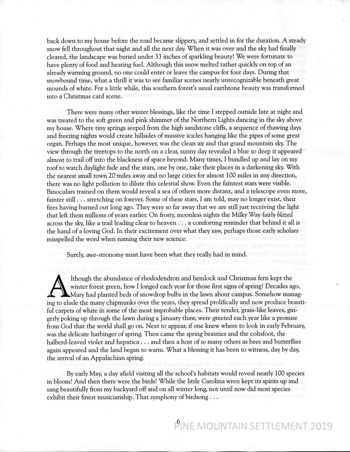 Smith lists other highlights of his PMSS experiences: seeing the Northern Lights; massive icicles on the high cliffs; viewing stars in clear night skies; the flowers and birds of Appalachian springs.