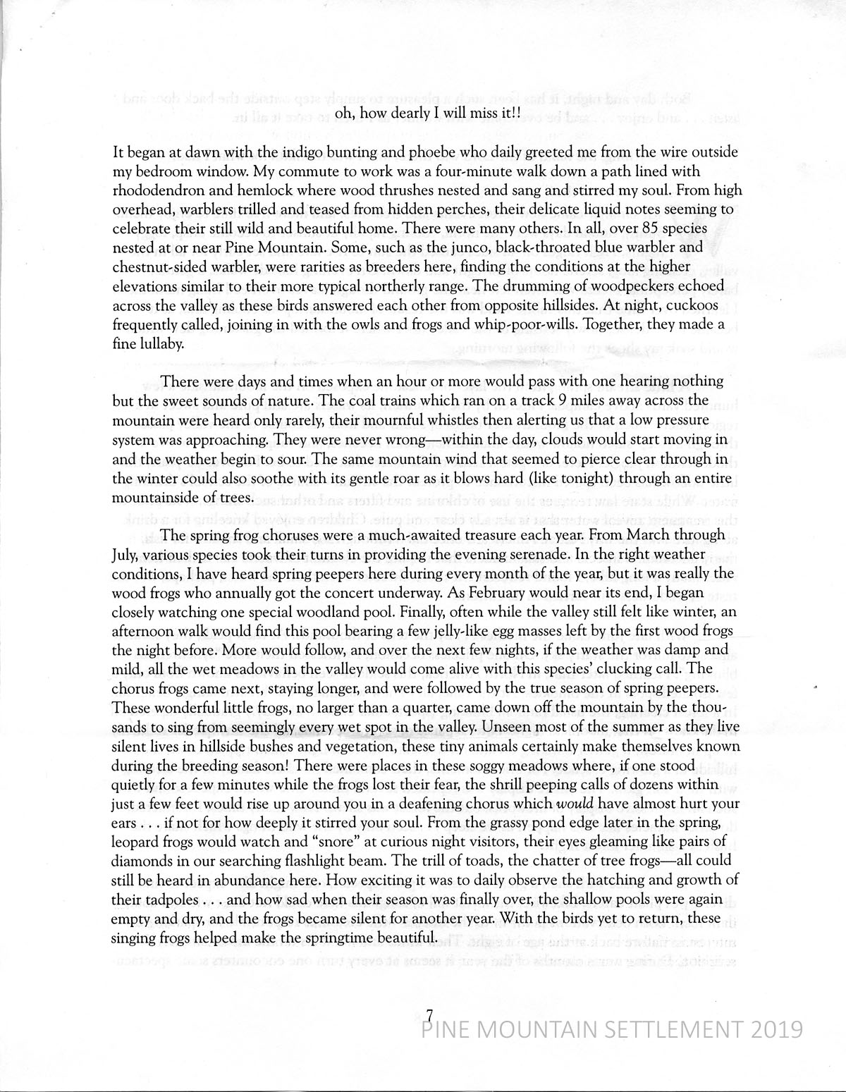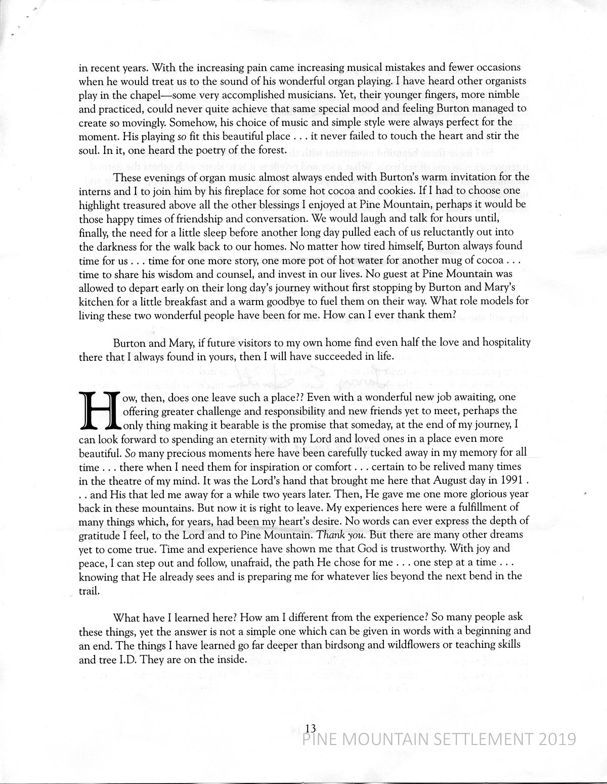 Smith describes his leaving PMSS on July 23, 1995, and his “rustic mountain home.” He decides to spend his last night writing his story, a thanksgiving prayer, a tribute to “the many dear people who have played a part” and an inspiration to friends and family to visit Pine Mountain, in reality or in their minds.