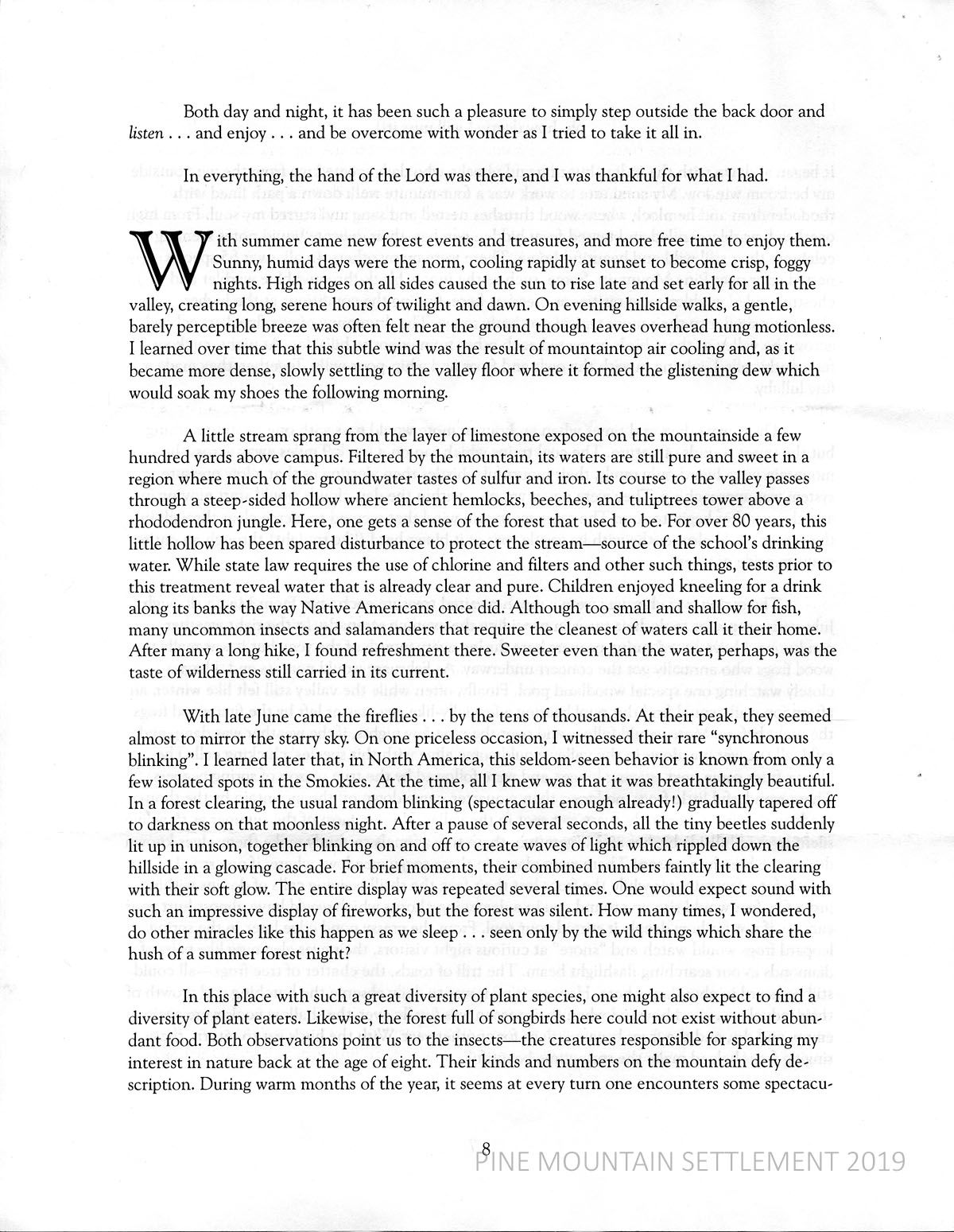 Smith’s summertime memories include the cooling mountaintop air as it settles in the valley and forms dew; a stream of pure and sweet water from the mountainside limestone, source of PMSS’s drinking water; the old forest that protects the stream; fireflies’ rare “synchronous blinking”; the wide variety of insects.