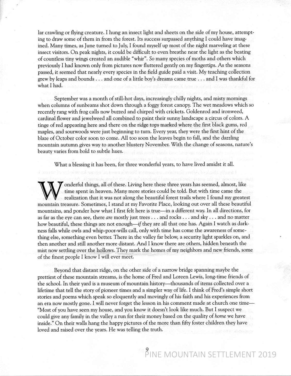 Smith’s memories of fall include a different variety of insects and flowers; the trees beginning to change color; the mountain autumn giving way to a blustery November. However, natural surroundings are not enough and Smith then writes about his “neighbors and new friends, some of the finest people I know I will ever meet.” He tells about Fred and Loreen Lewis and their home.