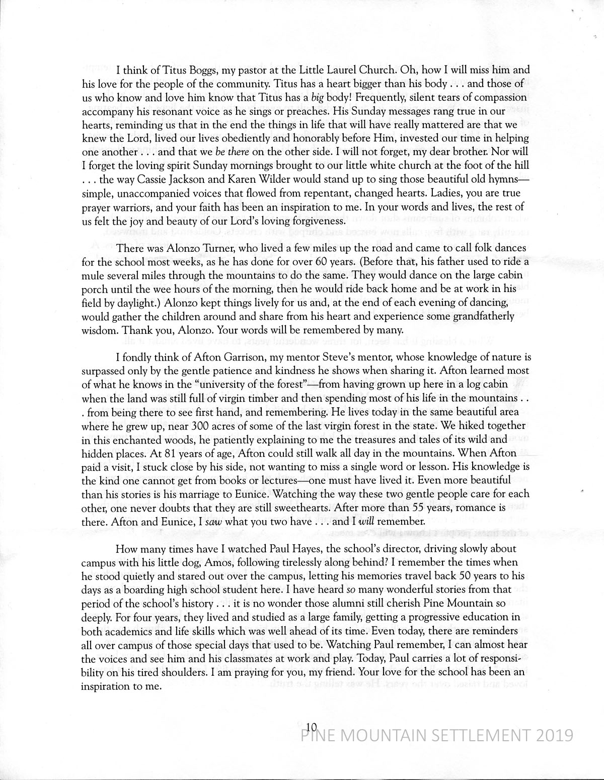 Smith remembers Titus Boggs, his pastor at the Little Laurel Church; Cassie Jackson and Karen Wilder singing hymns; Alonzo Turner, who, like his father, called folk dances for the School; Afton Garrison, Smith and Steve McKee’s mentor, and wife Eunice; Paul Hayes, the School’s director who recalls his boarding school days.