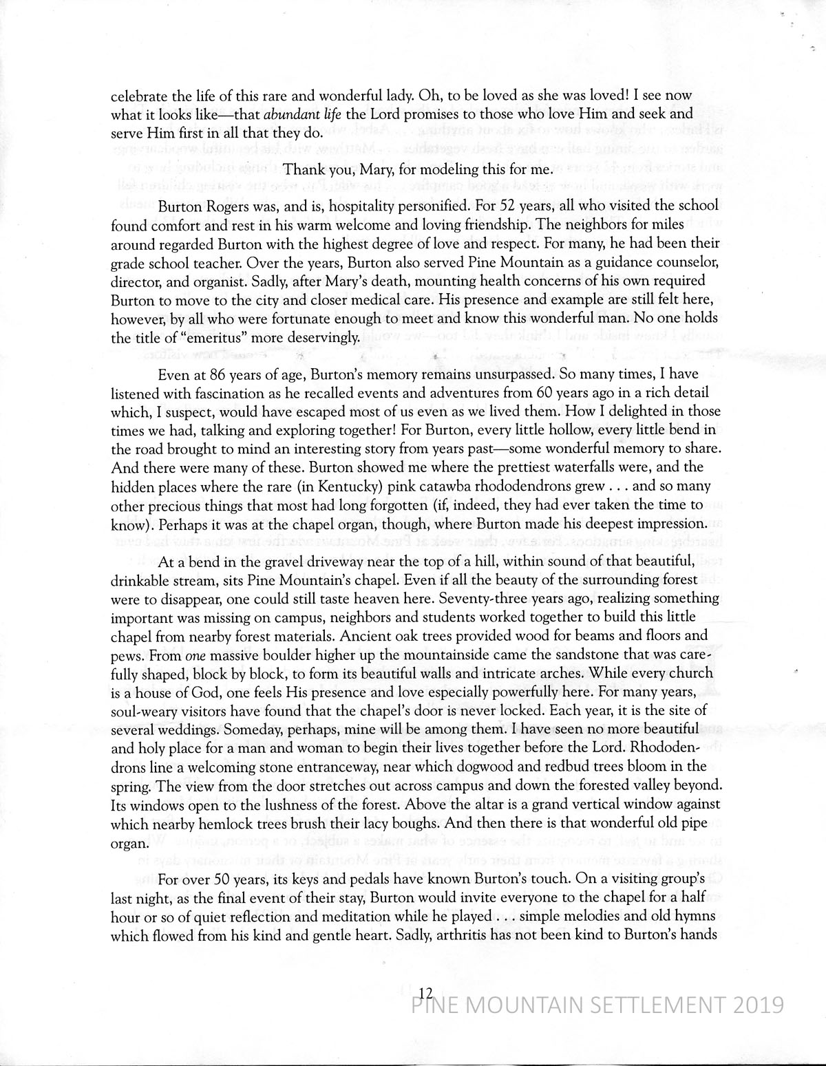 Smith tells about Burton Rogers‘ career and the love and respect he received from all who knew him; of listening to Burton’s stories from years past. He goes on to describe Pine Mountain’s Chapel and its pipe organ which Burton had played for over 50 years.