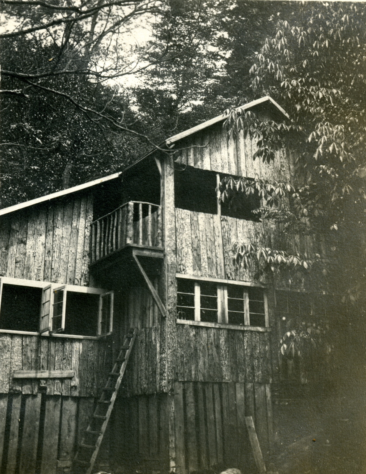 The house was of frame construction with a siding of slab lumber, generally lumber rejected at the mills, as it contained “imperfections” such as bark and knot-holes. The plan was a two-story structure with a large living room and fireplace elevated for cooking, a small kitchen area and a lower sleeping porch in the back of the home. The upper level contained a large sleeping porch that had open windows on three sides that looked out into the dense forest that surrounded the building. It was a cool and hospitable home in summer but was not suitable for winter living as it had no source of heat other than the interior fireplace on the lower level.