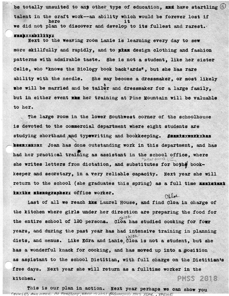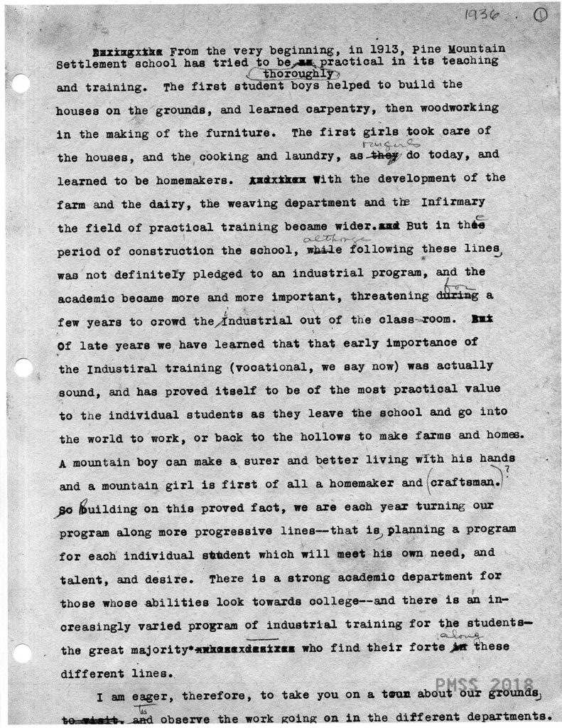 The 1936 walking tour of the Pine Mountain Settlement School campus provides details on many of the buildings at the School and their functions. Some of the buildings described are no longer standing nor do they function in the same manner. This descriptive walk reveals some little known information on buildings and provides valuable information about the function of buildings no longer standing.