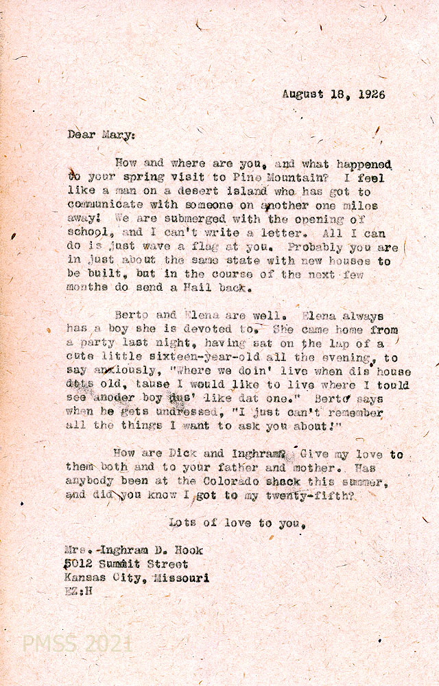 [010] August 18, 1926. To “Mary” from EZ (Zande), asking “what happened to your spring visit to Pine Mountain?”; quotes Berto and Elena.