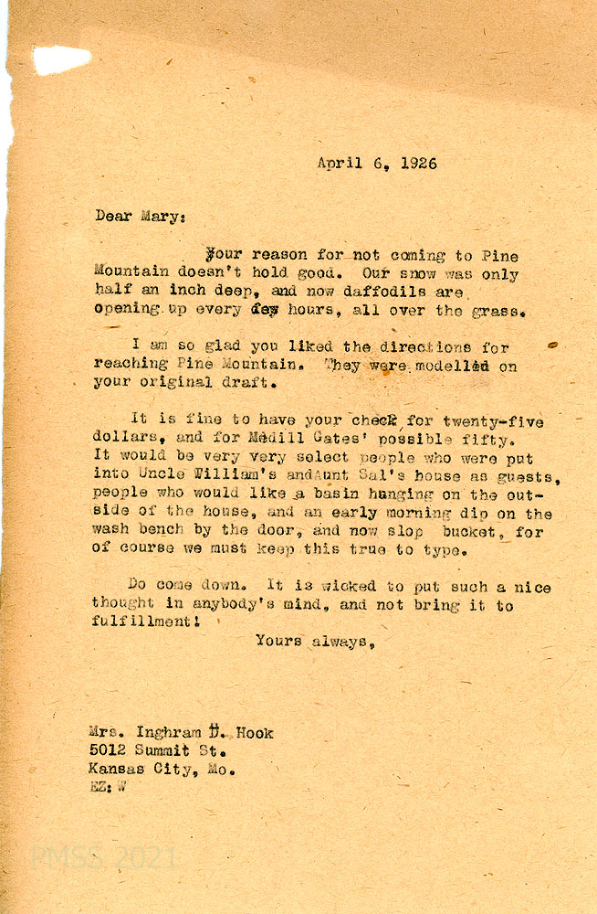 [009] April 6, 1926. To “Mary” from EZ (Zande). “I am so glad you liked the directions for reaching Pine Mountain. They were modelled on your original draft.” Acknowledges Hook’s $25 check for William and Sal Creech’s log house.