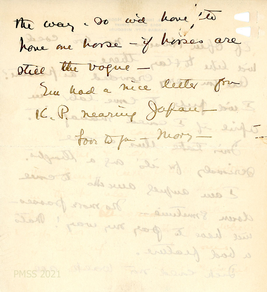 [006] March 23, 1926. To “Mary” from EZ (Zande), who responds to Hook’s “notion” to visit, sends directions to PMSS, and tells her what she may see at PMSS: the “dancing ladies” from Boston or special services by Mr. Zeigler, the preacher from Berea. Suggests Hook design a stained glass window for the PMSS church (Chapel).