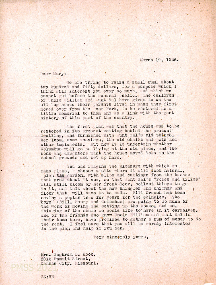 [005] March 19, 1926. To “Mary” from EZ (Zande). PMSS is raising money, about $250, to help restore Uncle William and Aunt Sal Creech’s old log house (Aunt Sal’s Cabin); describes arrangements with the Creech children and plans to furnish it and create a garden of Aunt Sal’s flowers. “Bill Creech has been saving a poplar tree for years for the shingles. The ‘boys’ (Bill, Henry, and Columbus) are going to much of the work of moving and setting up the house.”