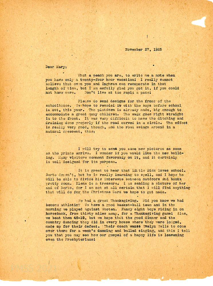 [004], [004a] November 27, 1925. Two-page letter to “Mary” from EZ (Zande), [004] asking her to “send designs for the front of the schoolhouse (School House). We hope to remodel it with the boys before school is out, this year. The platform is already made, big enough to accommodate a great many children. The walk goes right straight in to the front. …”; will send photos. Mentions their children, Dick (Hook), Berto (Zande) and Elena (Zande). Describes Thanksgiving, including the basketball team’s game against Wooten: “Fancy eight boys riding in on horseback, from thirty miles away, for a Thanksgiving game!” with dinner and country dancing afterwards. [004a] Reports that “Marguerite Butler and Mrs. Campbell are actually starting the John C. Campbell Folk School at Brasstown, North Carolina….” Mentions Luigi’s (Luigi Zande) desire to see his mother but they can’t afford the trip.