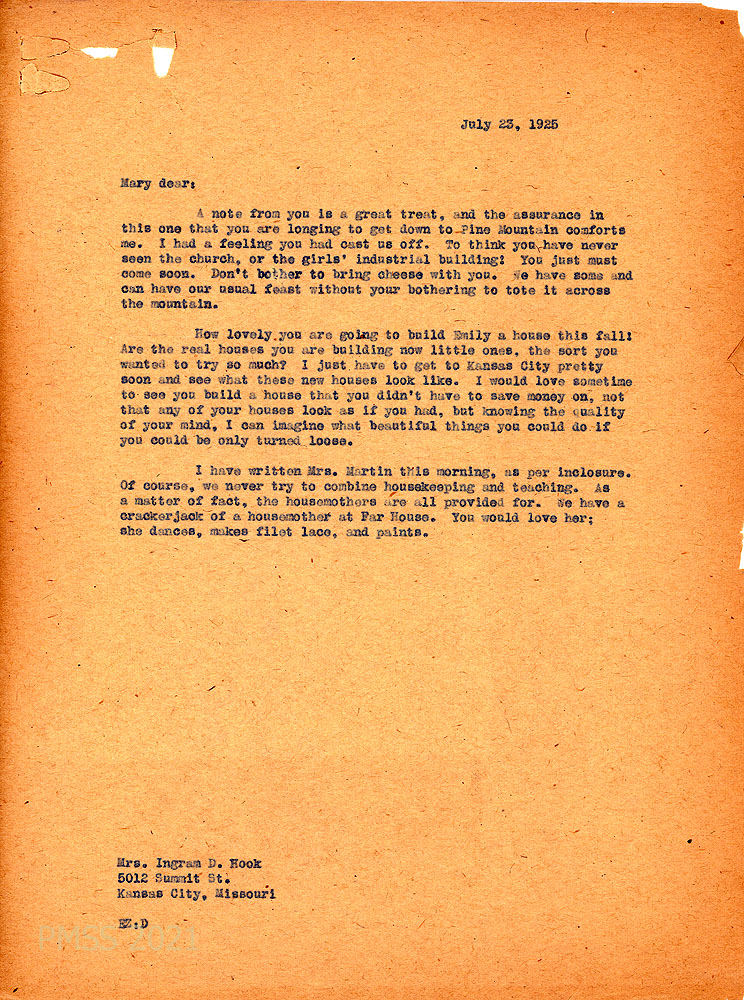[002] July 23, 1925. To “Mary dear” from EZ (Zande), responding to Hook’s letter in which Hook expresses a longing to visit PMSS; insists that Hook “come soon” to see the new church (Chapel) and the Girls’ Industrial Building. Zande comments on the house Hook is planning to build for “Emily”; encloses a copy of her letter to Mrs. Martin.